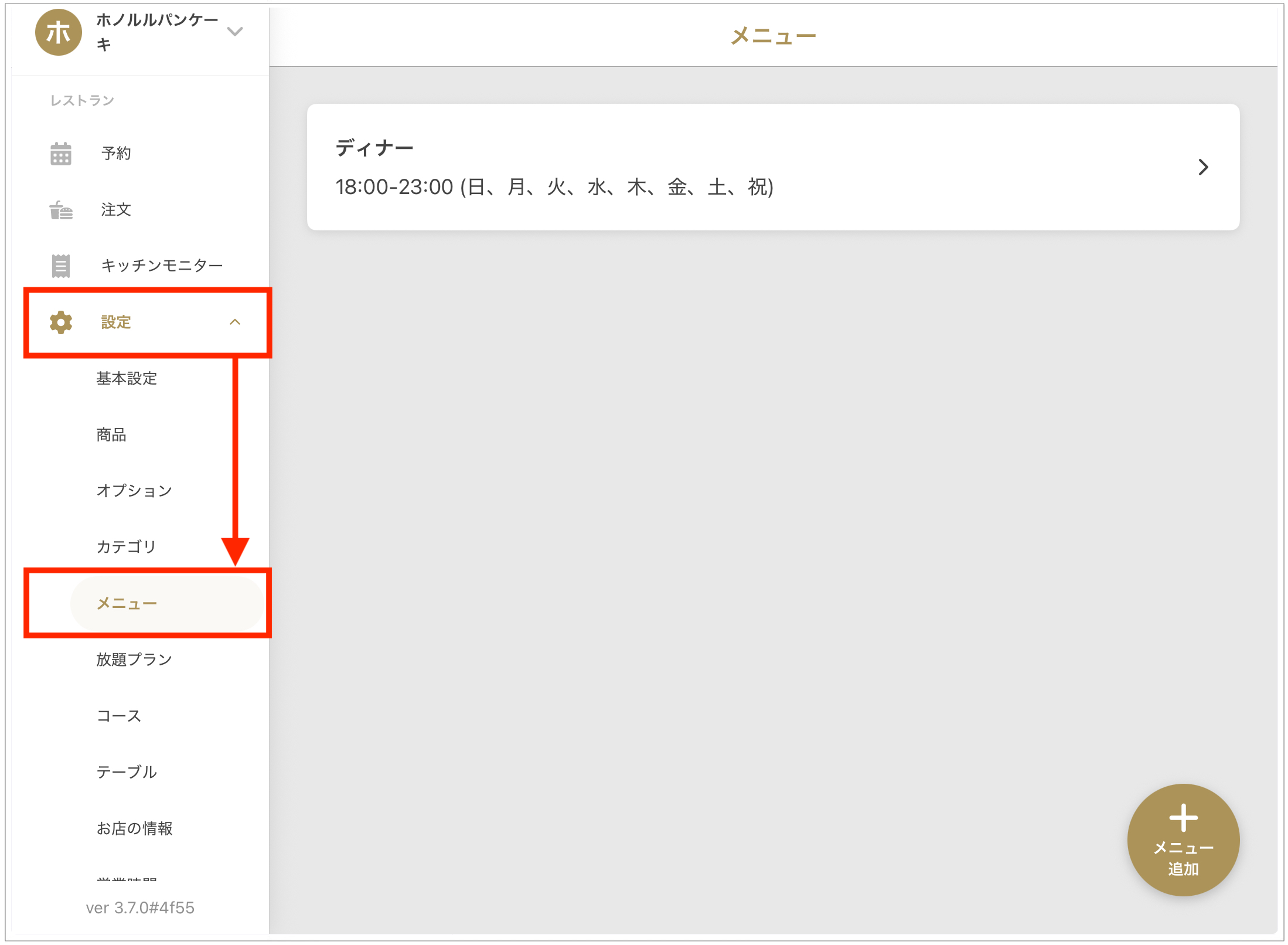 「レストラン」>「設定」>「メニュー」からメニュー設定画面を開くことができます。