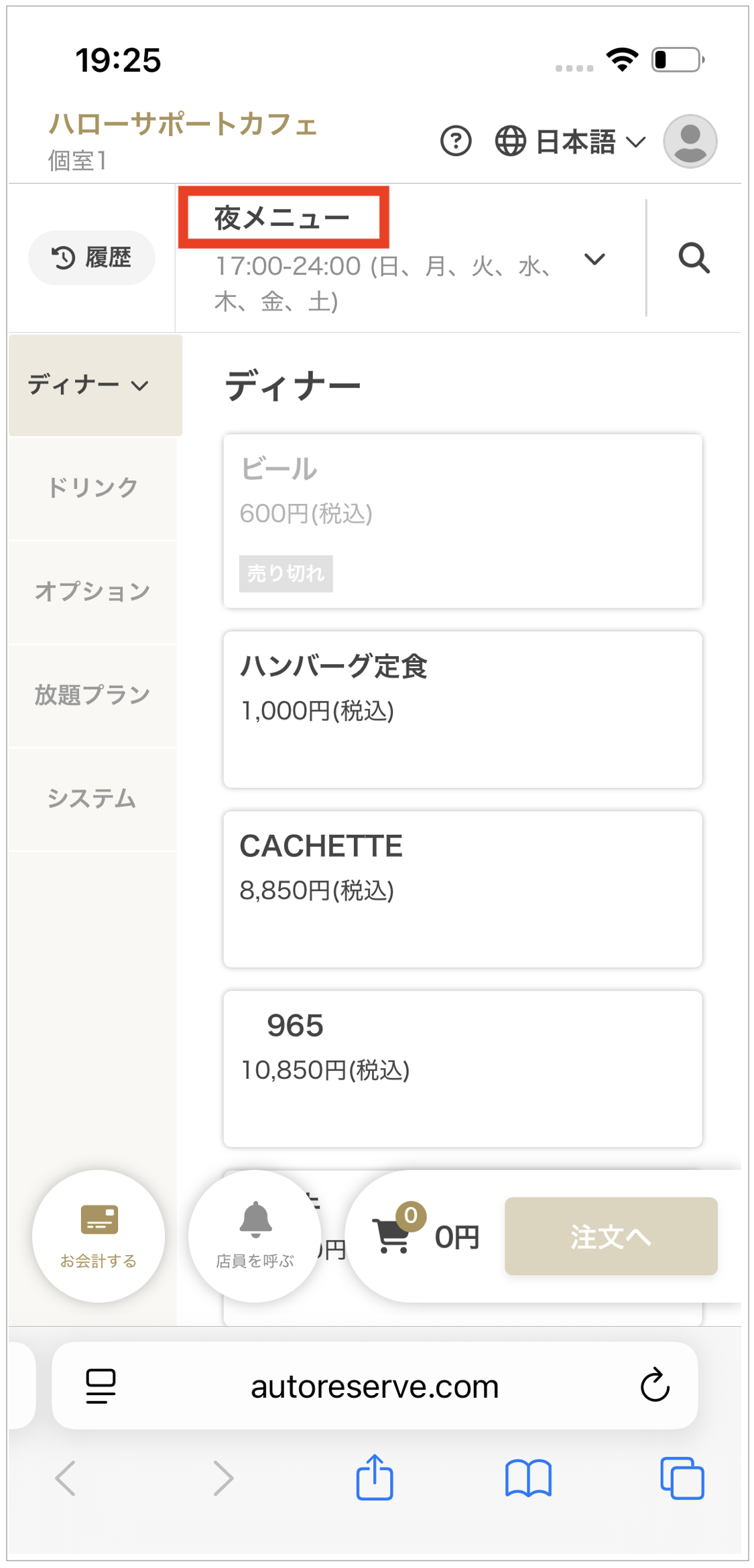- 「営業時間」で設定した時間の前後に、お客様がメニューから注文を操作できるようになります。