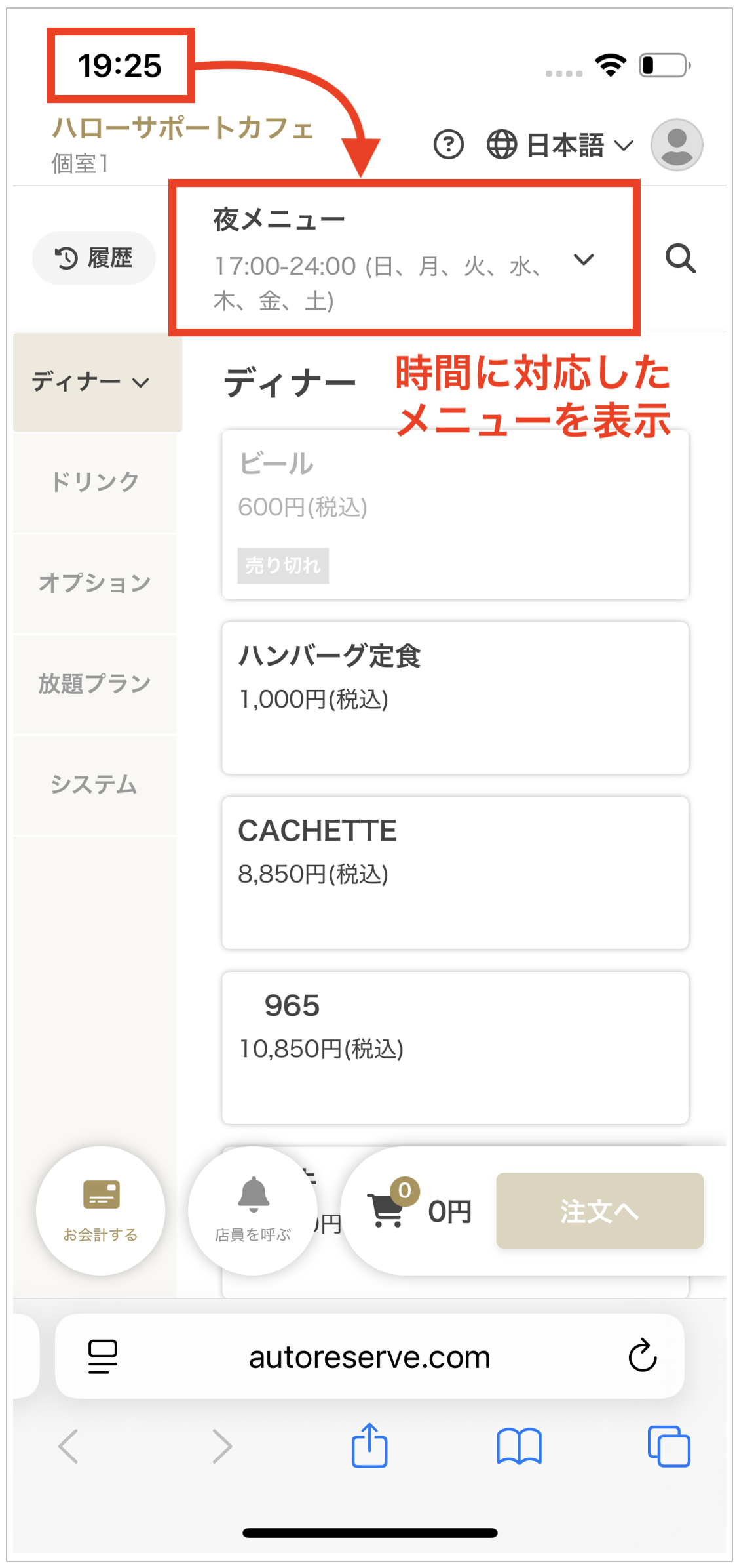 「営業時間」設定で登録した 開始〜終了時間 に基づいて、メニューが表示されます。