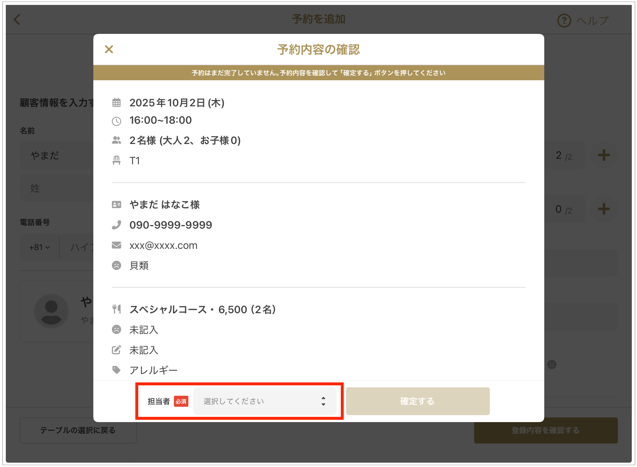 2. 「予約内容の確認」画面で、担当者を選択して「確定する」を押します。