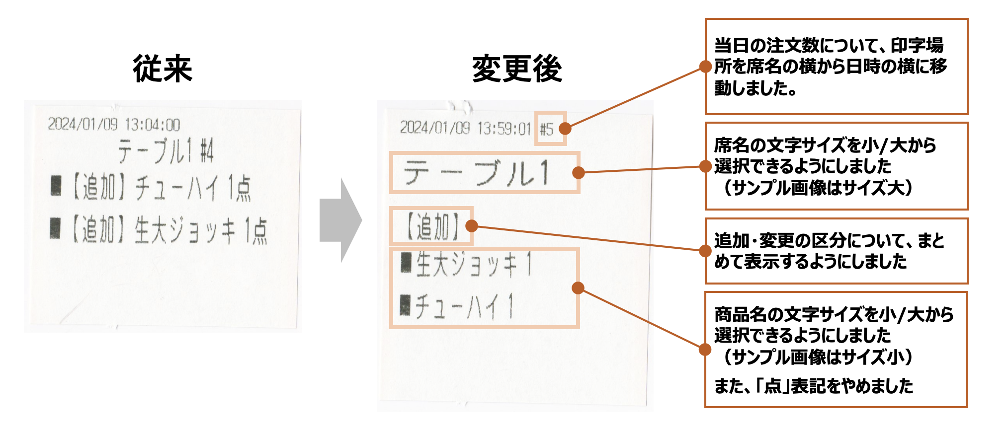 キッチン伝票の表示改善 2024年01月11日 00:33 更新 キッチン伝票の印字を、以下の通りに変更いたしました。 関連記事 【予告】注文TOP画面のリニューアルについて 予約詳細画面から顧客の前回の注文内容を表示するようにしました 【機能改善】注文TOP画面をリニューアルいたしました 【準備】決済端末を接続する(Respo Pay) オンライン決済の返金方法