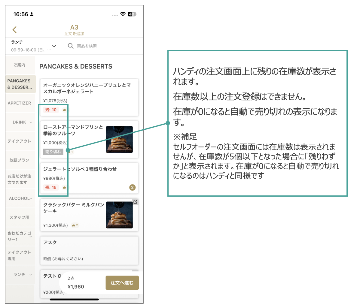 在庫を設定している場合、ハンディの注文画面に在庫数が表示されます。