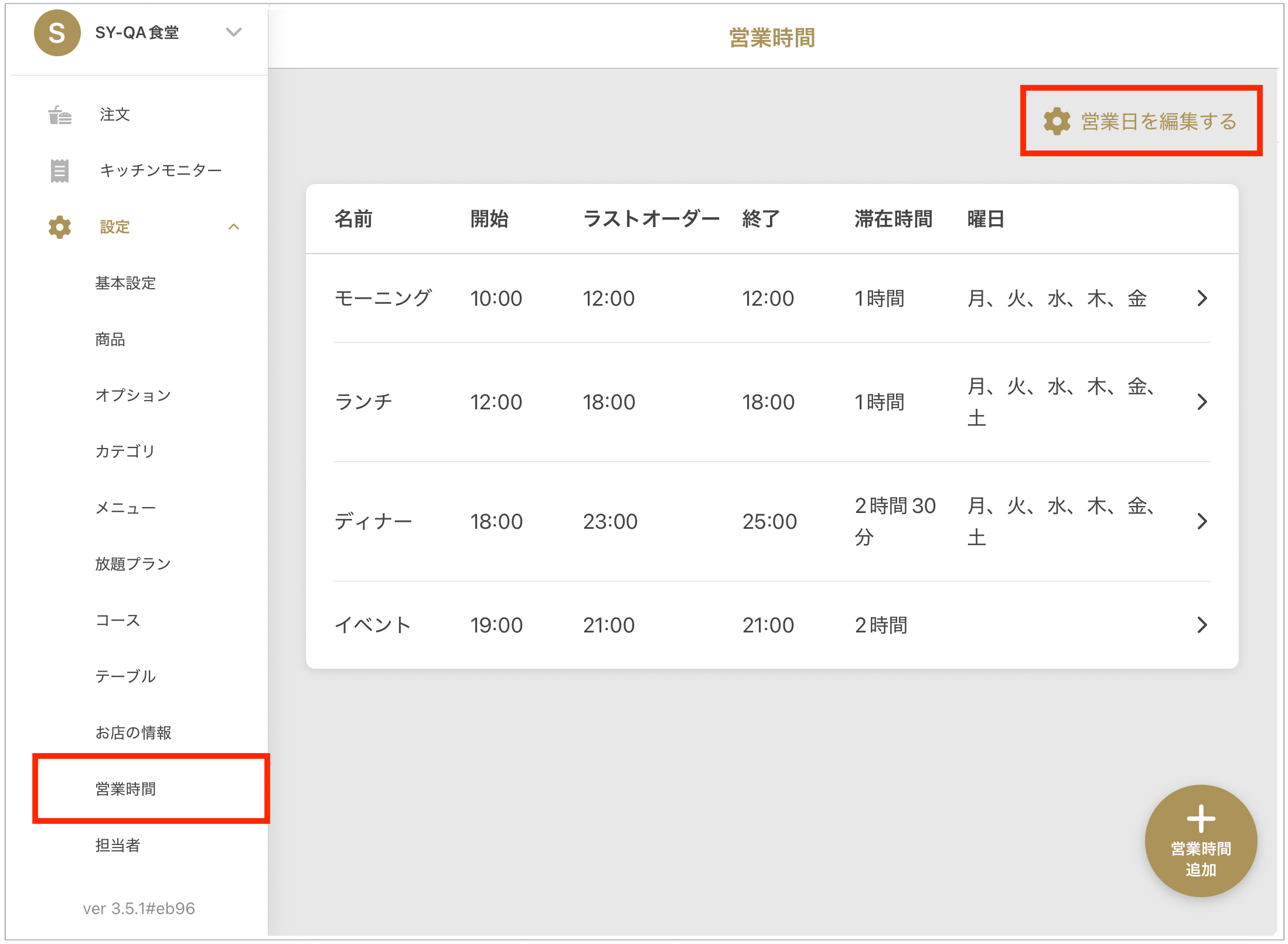 2. 営業時間を変更したい日付と営業時間を選択します。