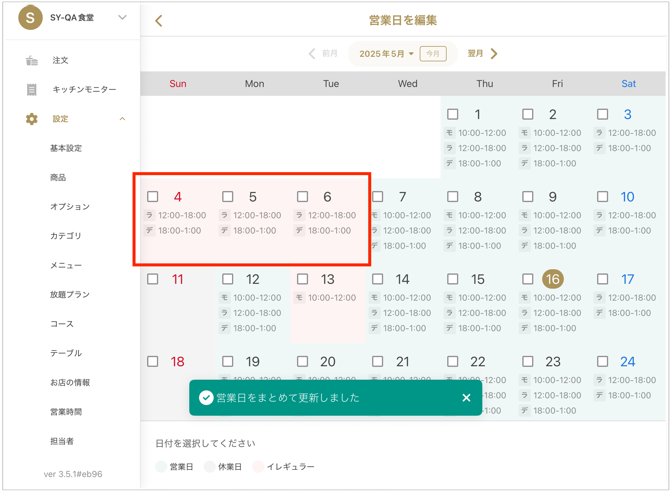 このとき、複数の日付にチェックを入れて、まとめて更新することも可能です。