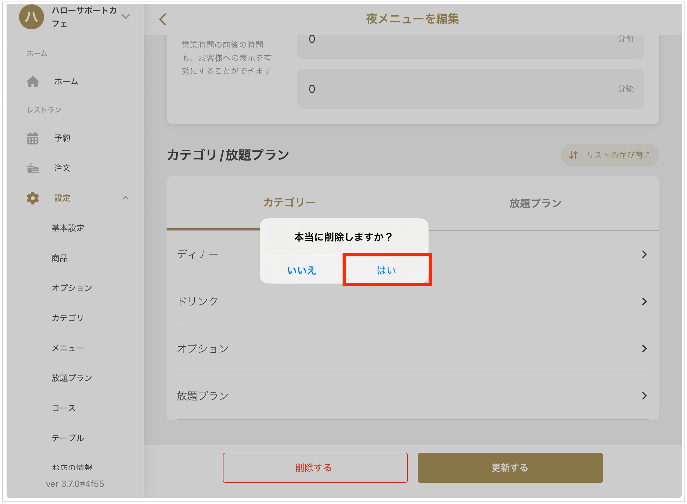 ※「はい」を押すとメニューは完全に削除され、復旧できません。ご注意ください。