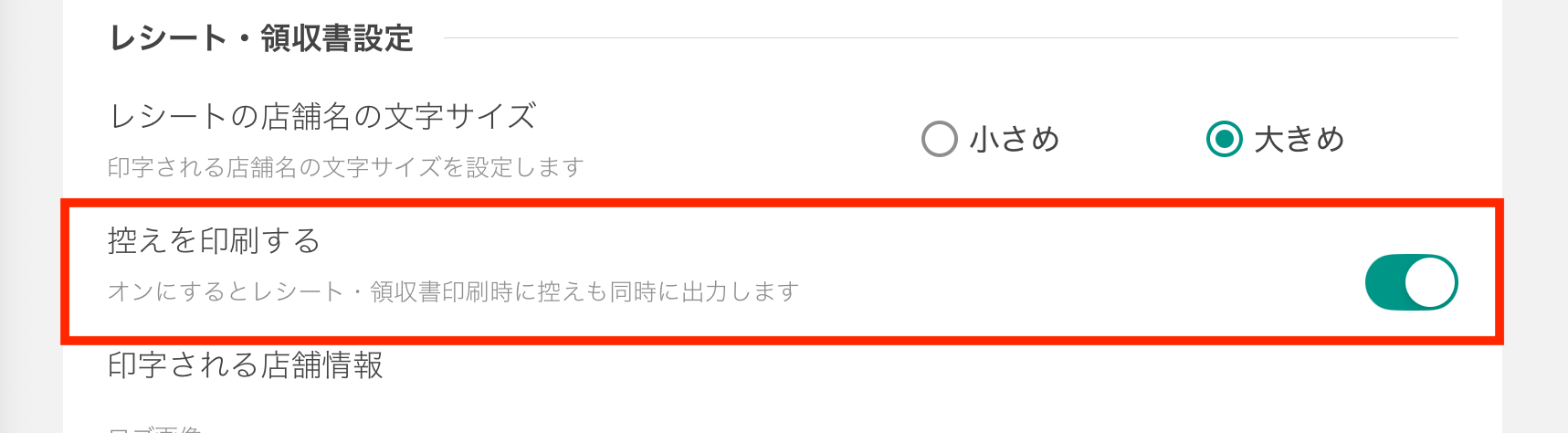 オンにすると、レシート・領収書を印刷時に、お客様控えと同時に店舗控えも出力します。