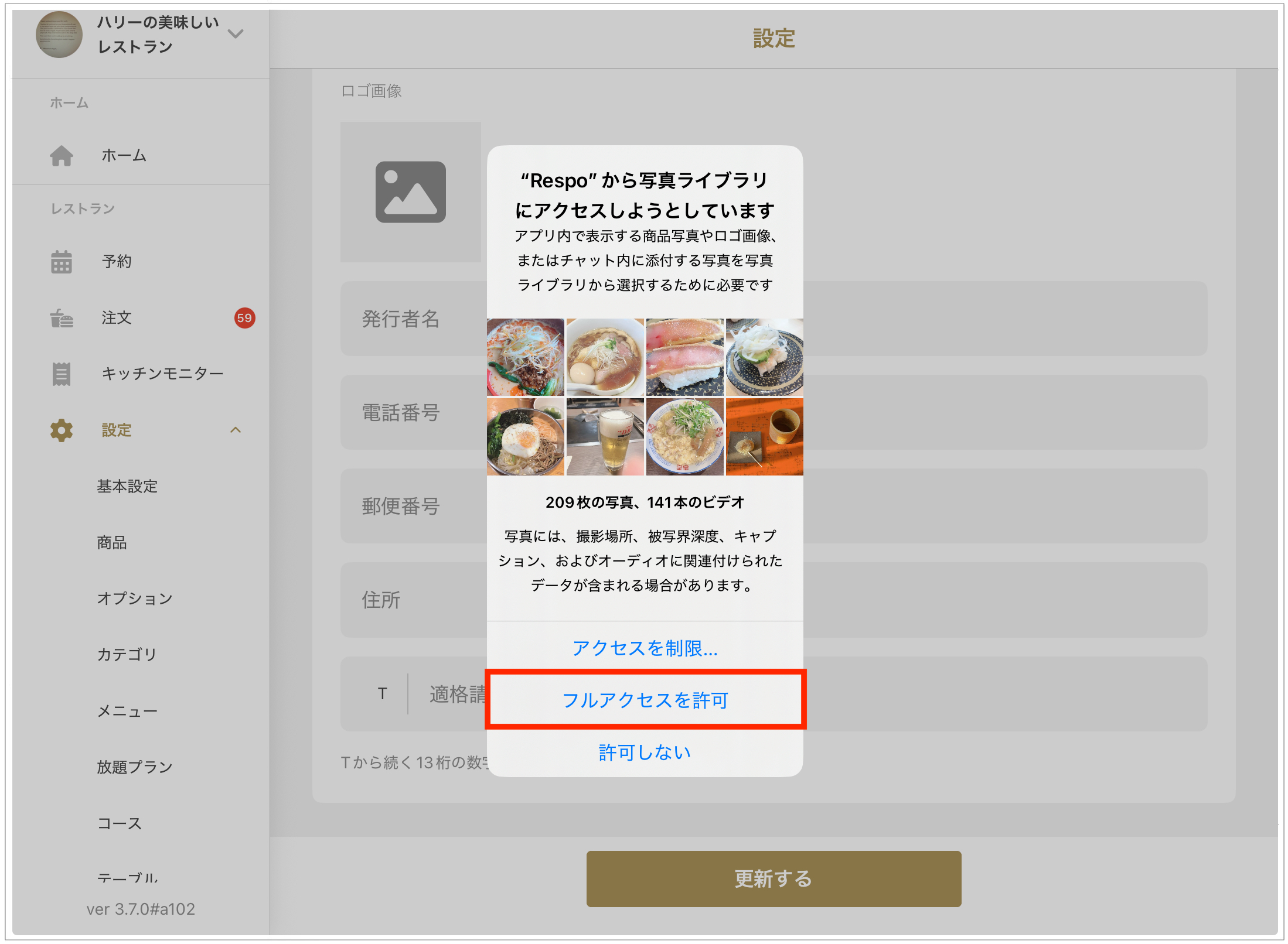 このとき、写真ライブラリへのアクセス許可が求められたら、「フルアクセスを許可」を選択してください。