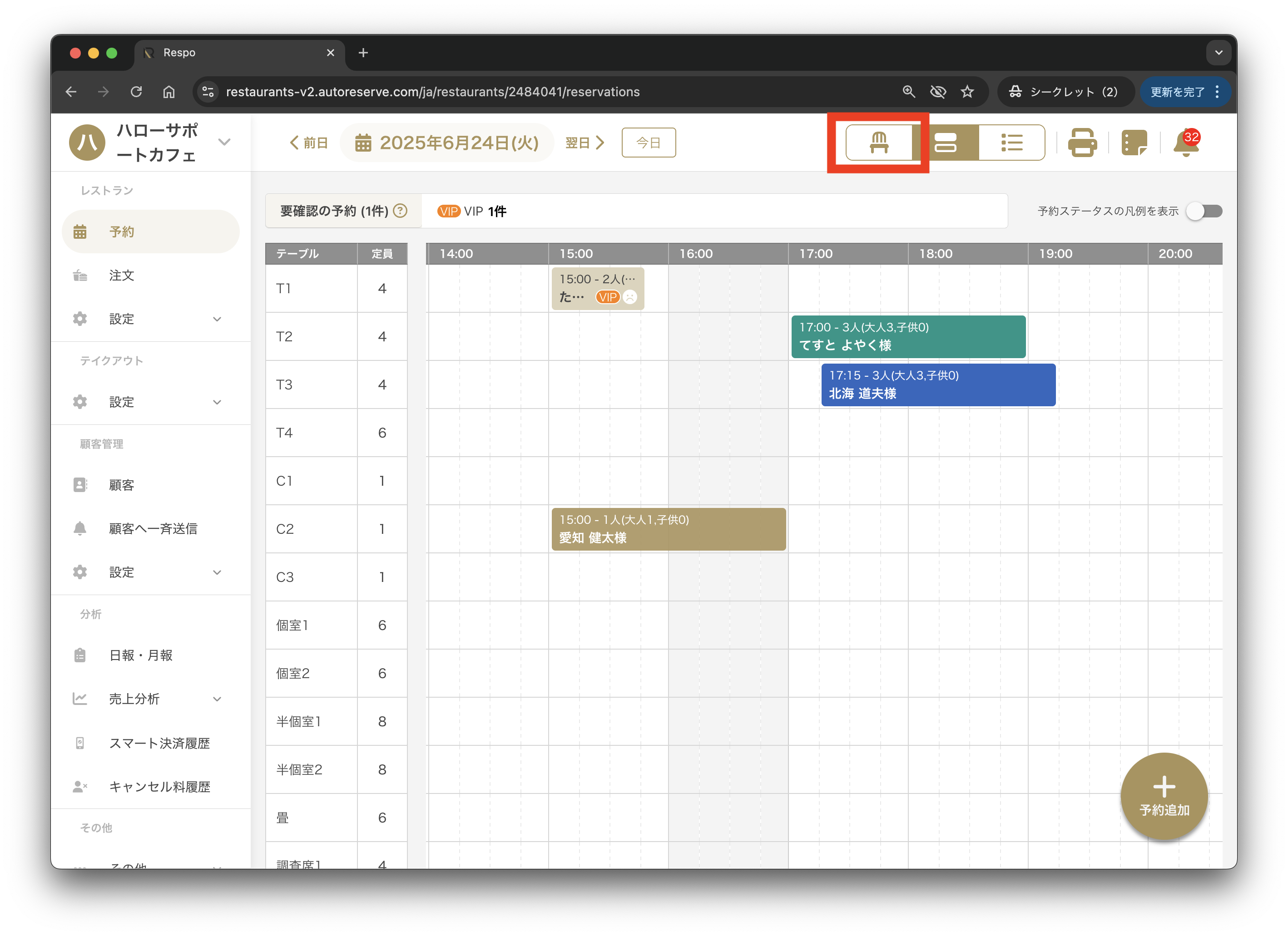 iPad版と同様に、予約台帳画面の右上の椅子アイコン「フロアマップ」から表示を切り替えることができます。