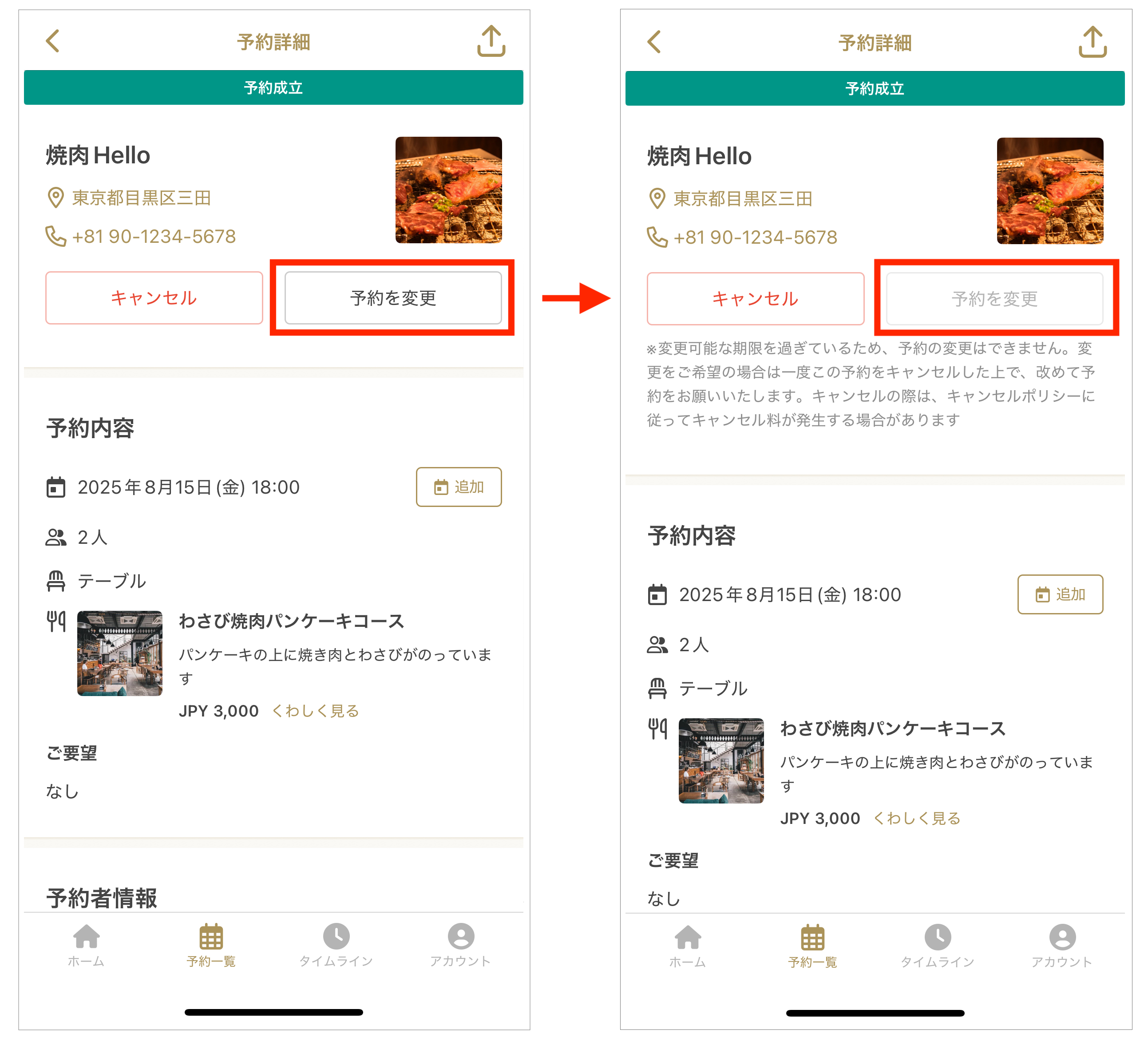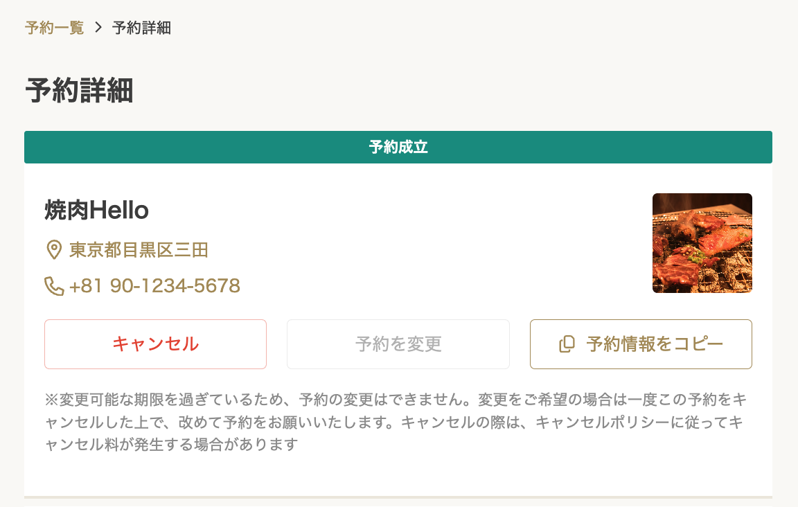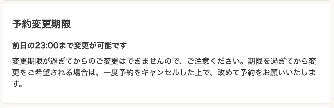 3. 変更期限を過ぎた場合、「予約の変更」ボタンが押せなくなり、変更期限についての注釈が表示されます。