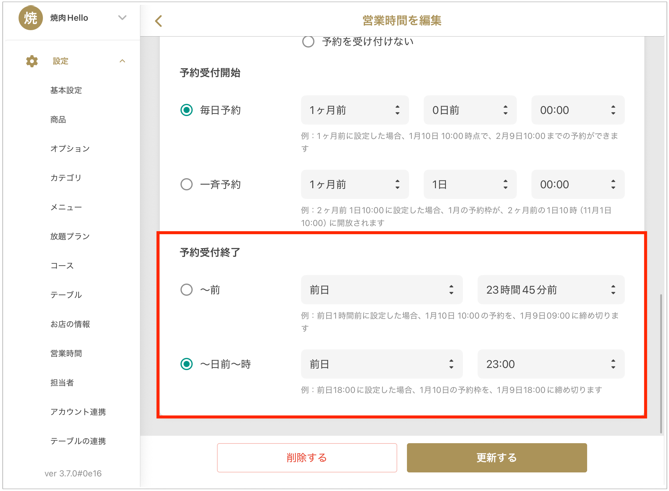 3. コースの予約受付終了の方法で「営業時間に従う」を選択している場合は、営業時間設定の「予約受付終了」の日時通りに変更期限も設定されます。