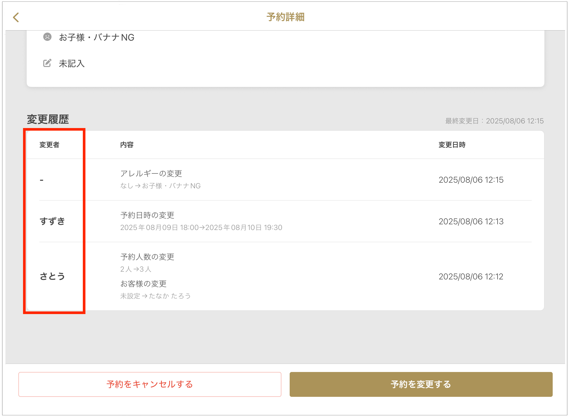 予約担当者の機能を有効にしている場合、予約の変更をした担当者名も残すことができます。
