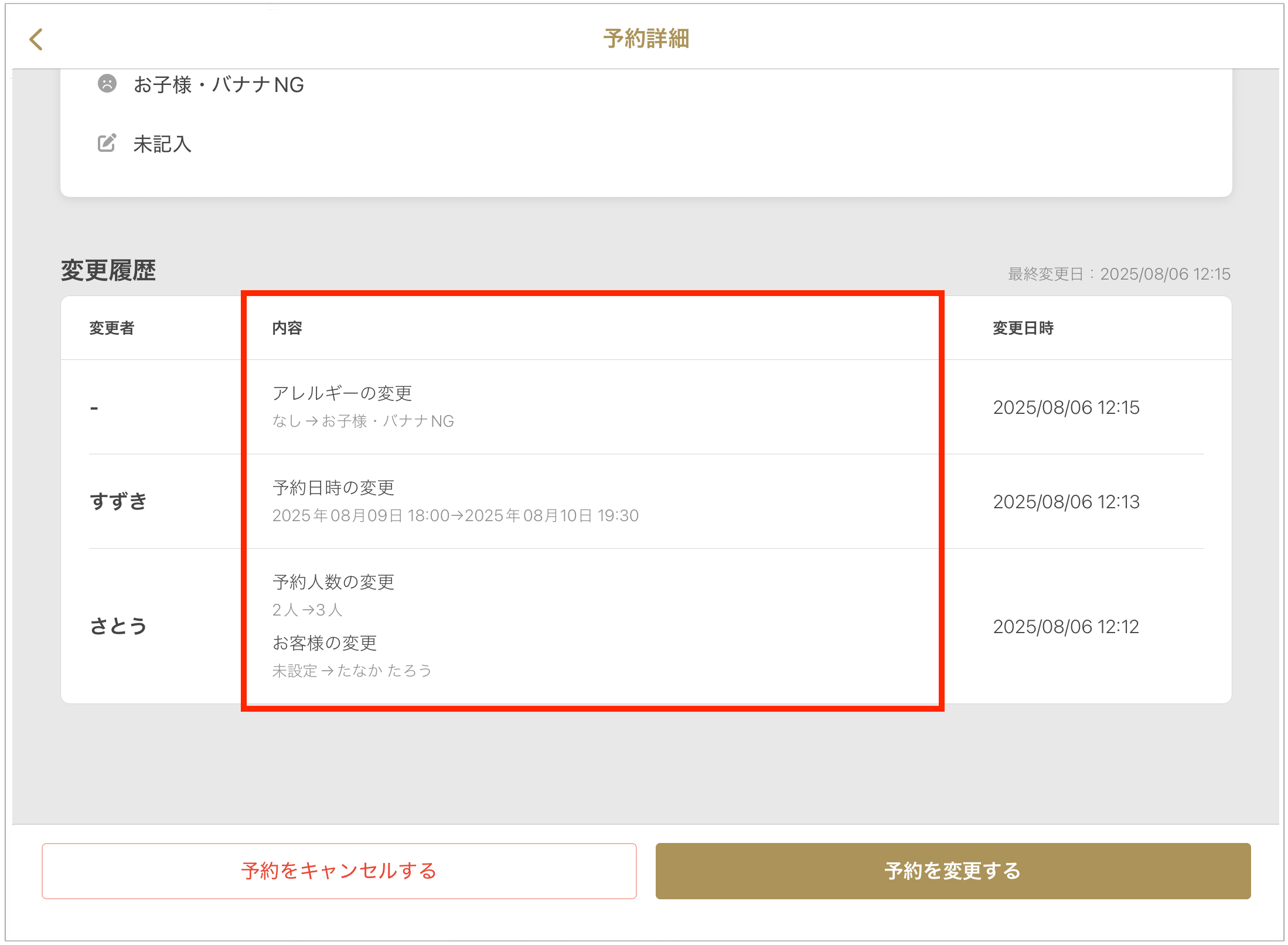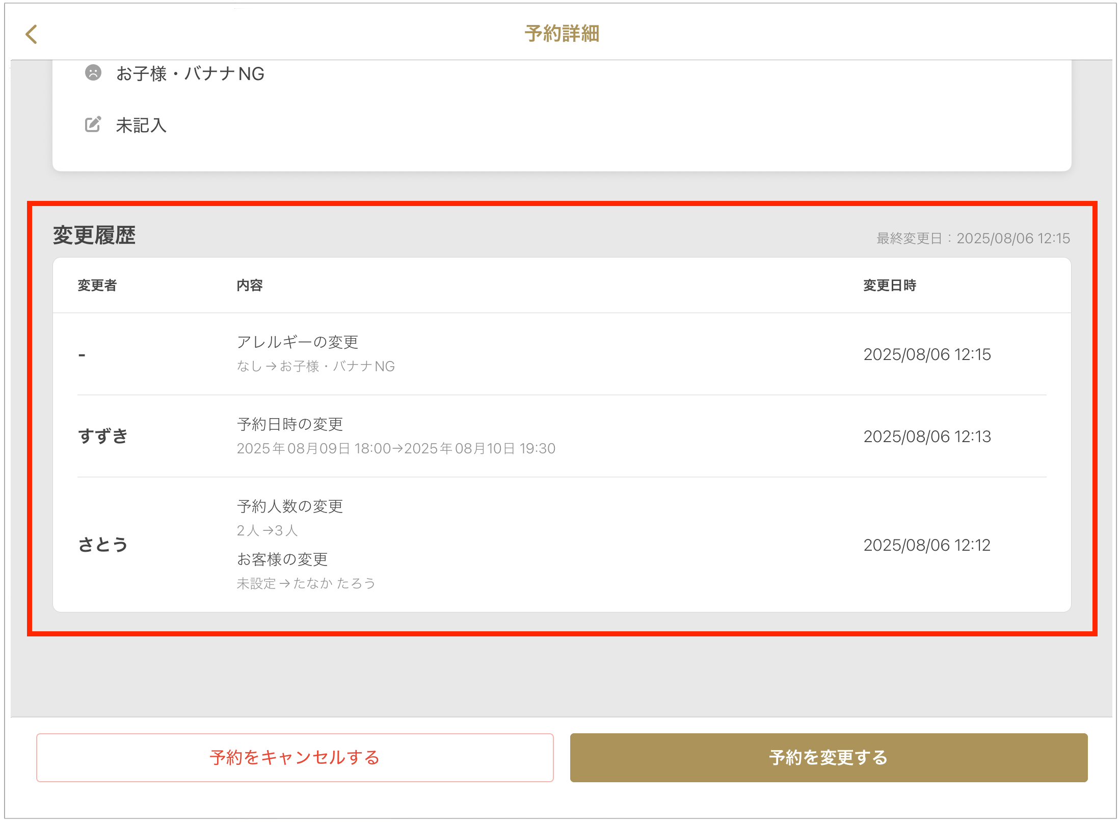 店舗側で行った予約変更の内容が、予約詳細画面に変更履歴として記録されるようになりました。