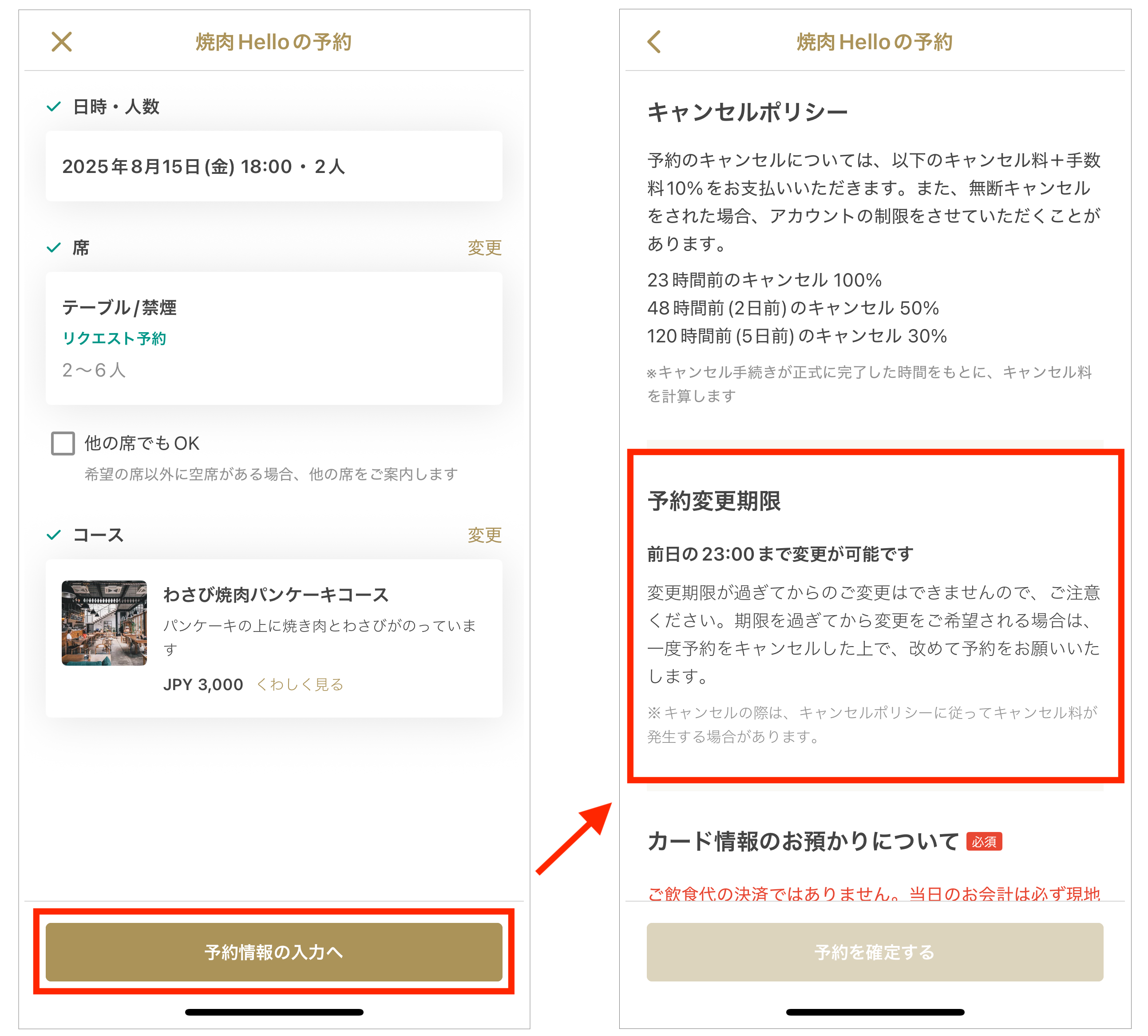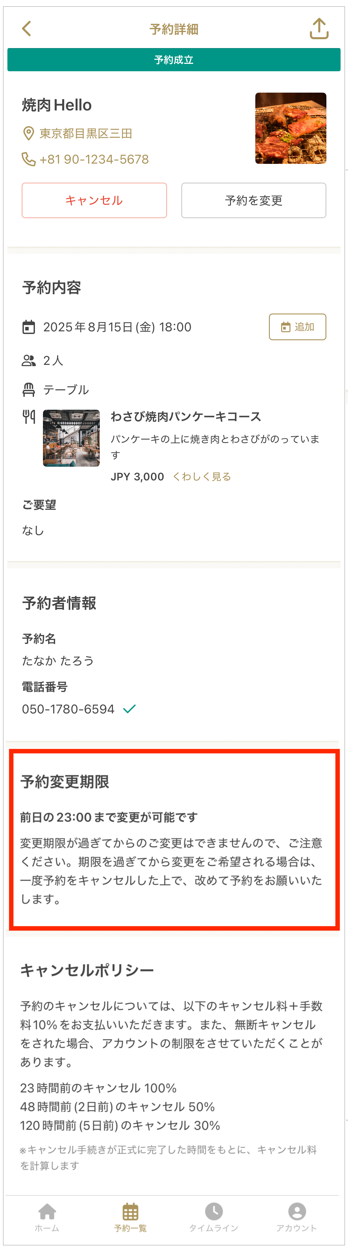 2. 予約成立後も、予約詳細画面で変更期限を確認することができます。