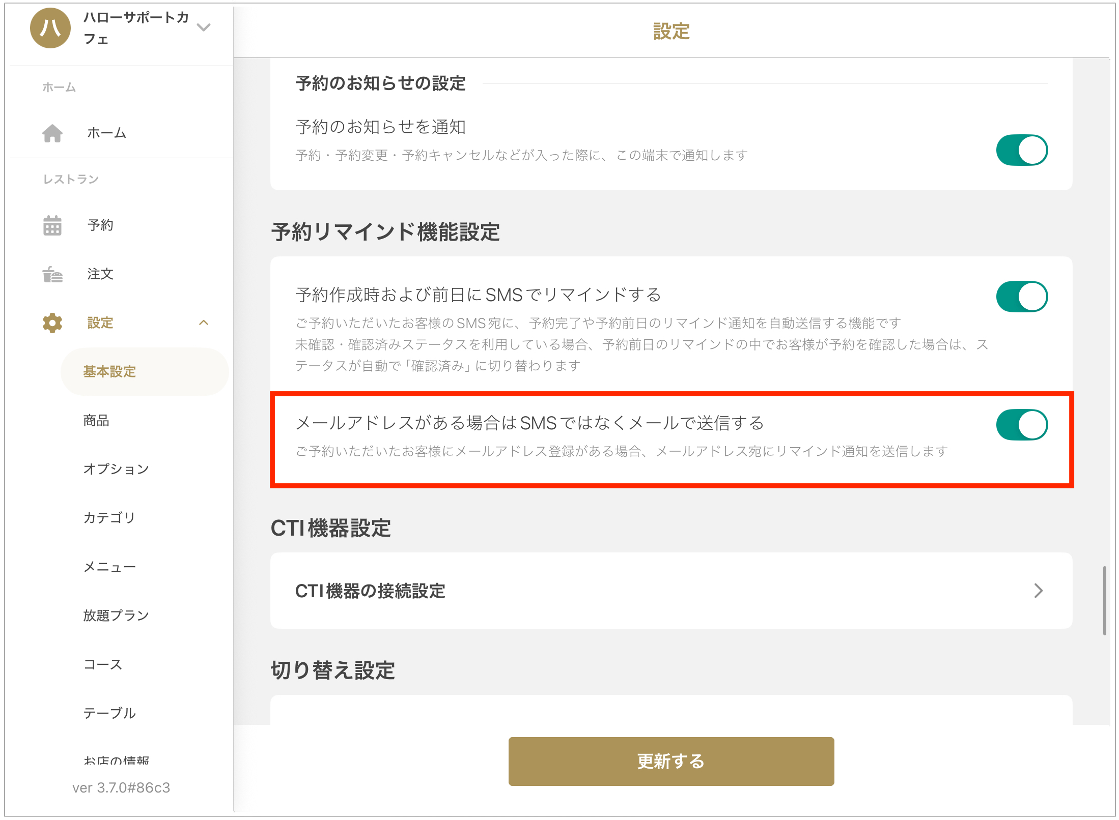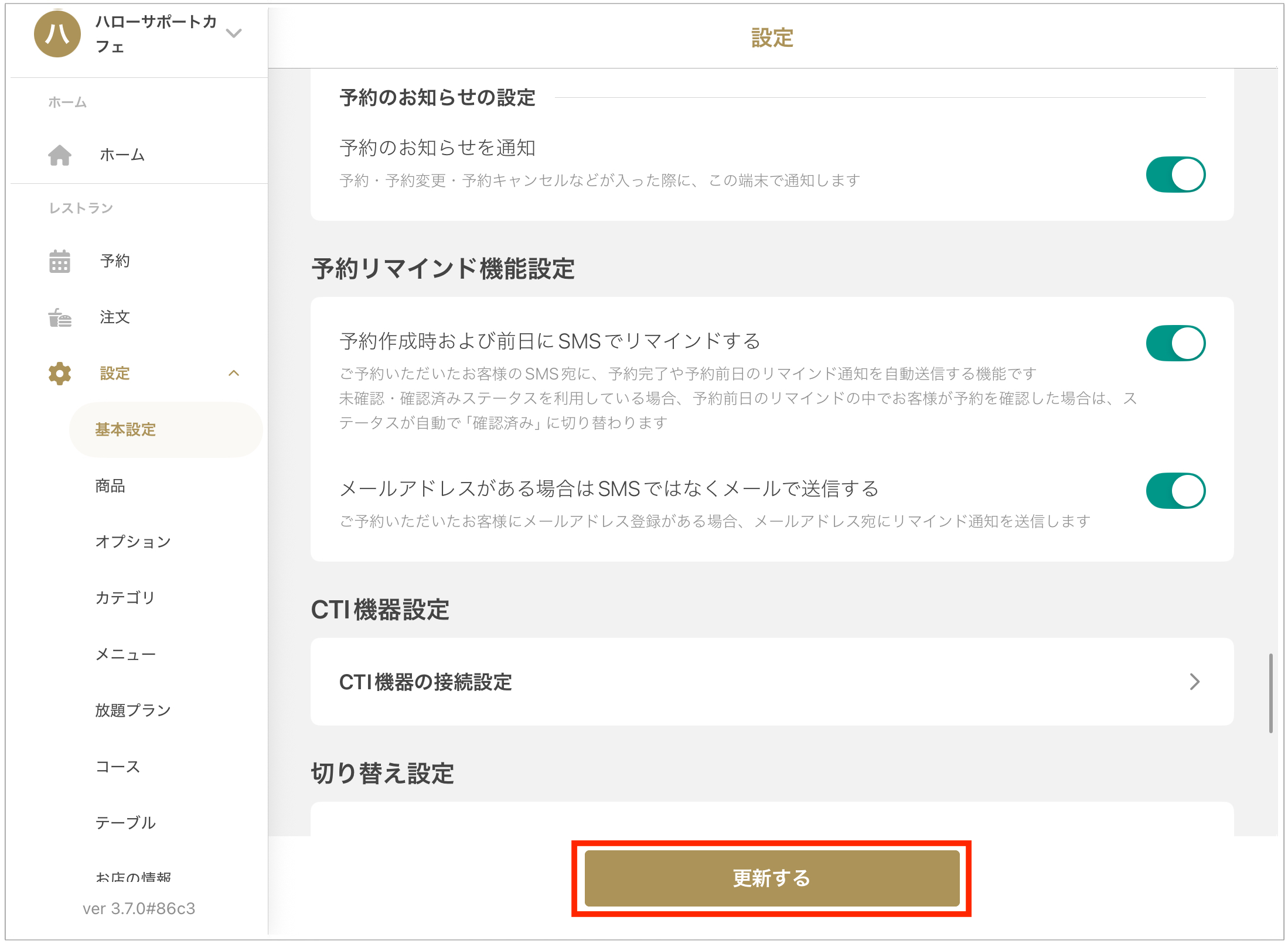 1. 「レストラン」>「設定」>「基本設定」を開き、「予約リマインド機能設定」項目を確認します。