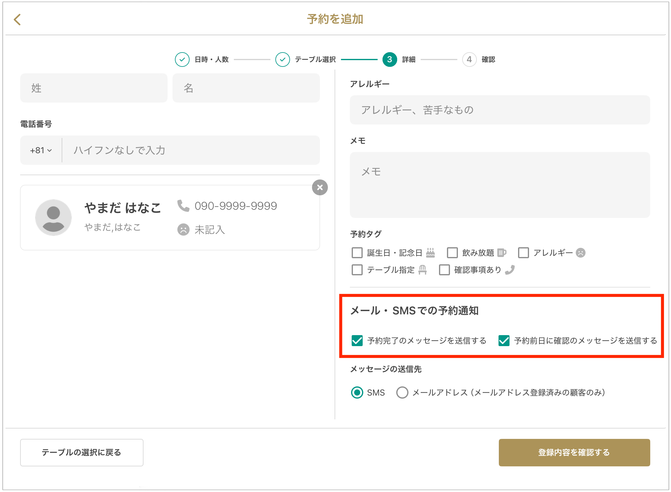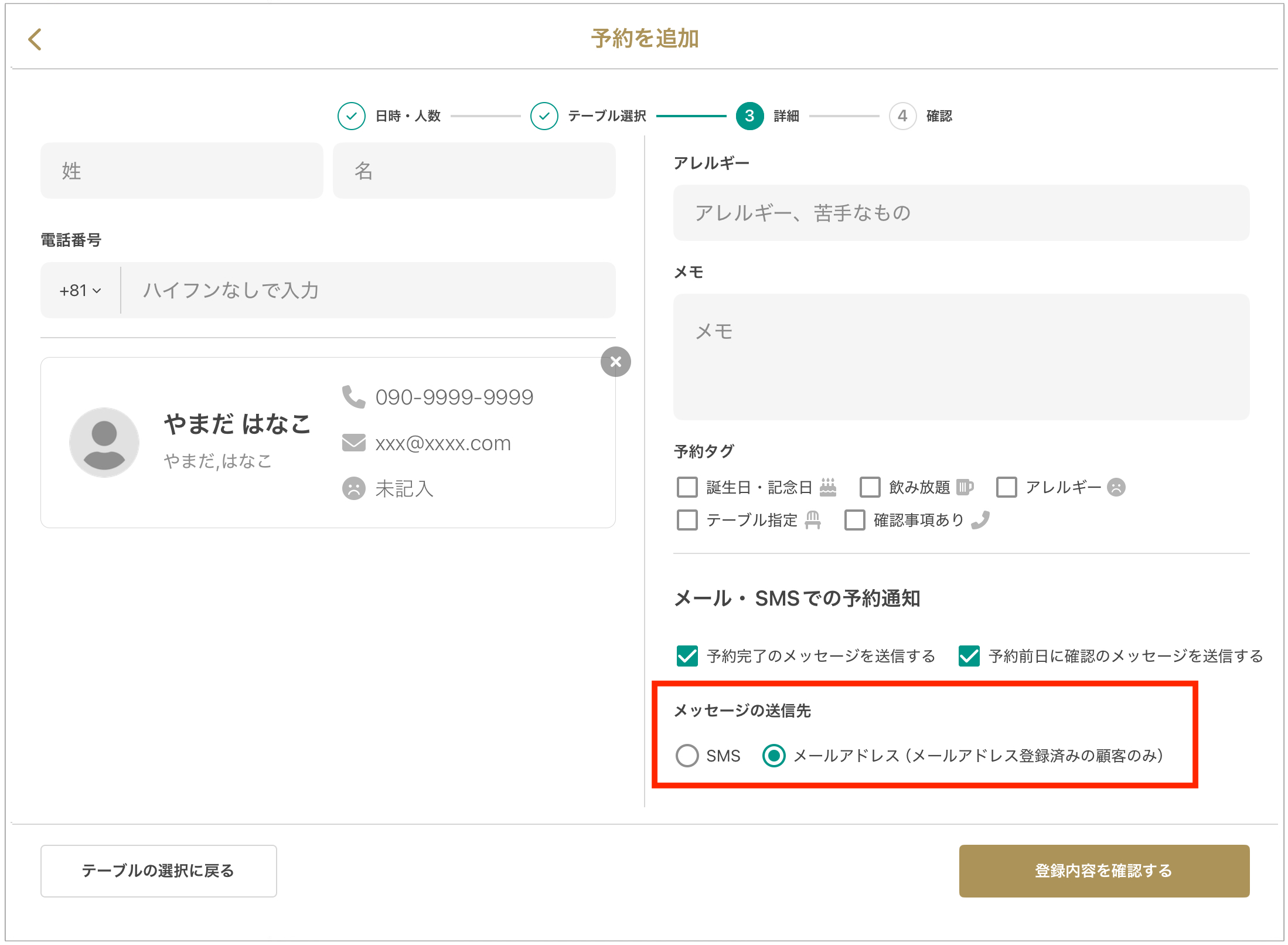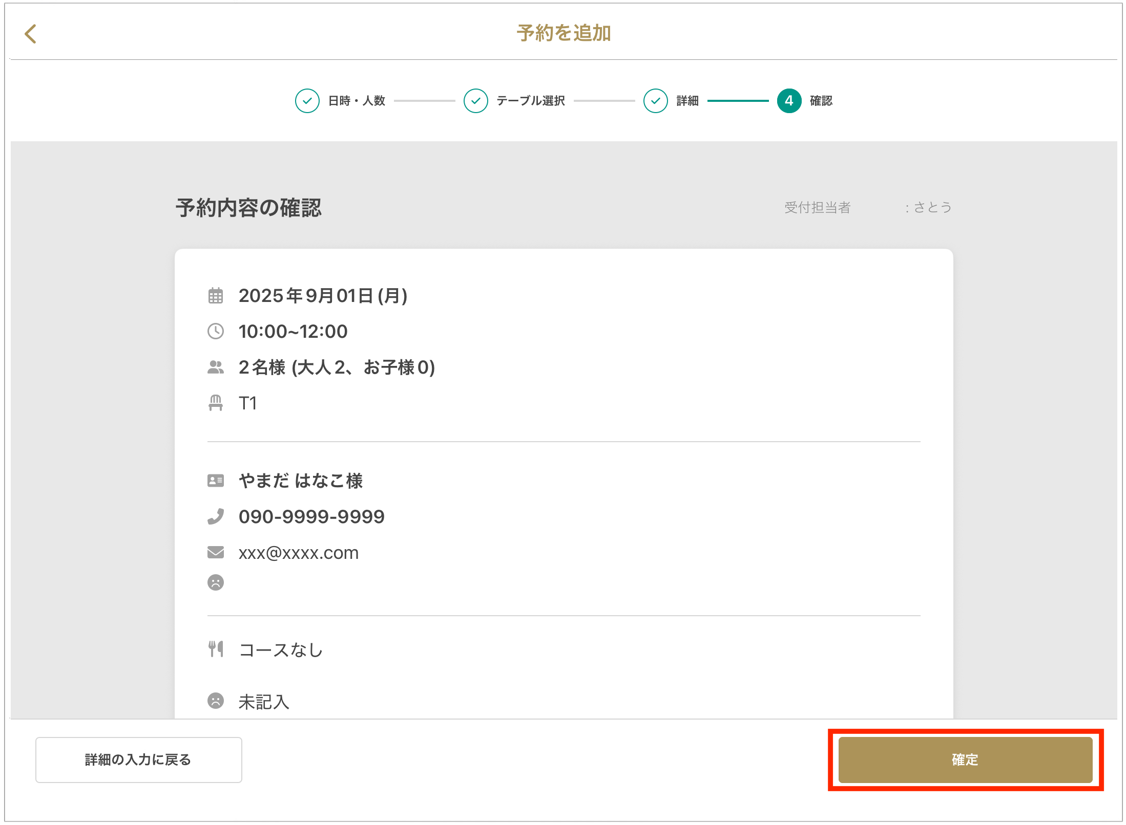 1. 予約の新規作成から日時、人数、テーブル等を選択し、「詳細」画面まで進みます。