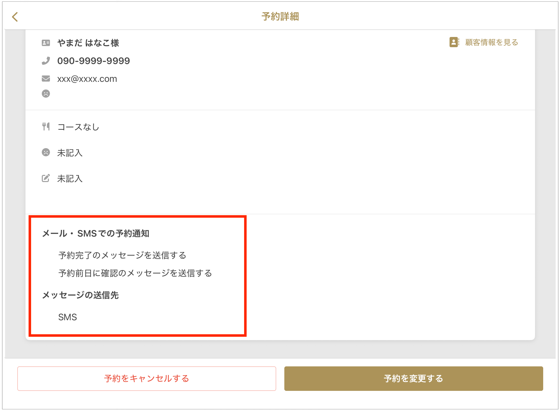 各通知の送信先は、顧客情報に登録されている電話番号またはメールアドレス宛に送信されます。