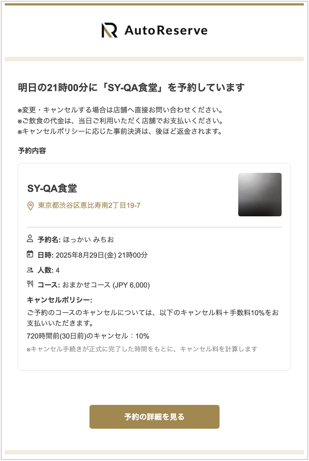 本文内の「予約の詳細を見る」ボタンから予約詳細を確認できます。