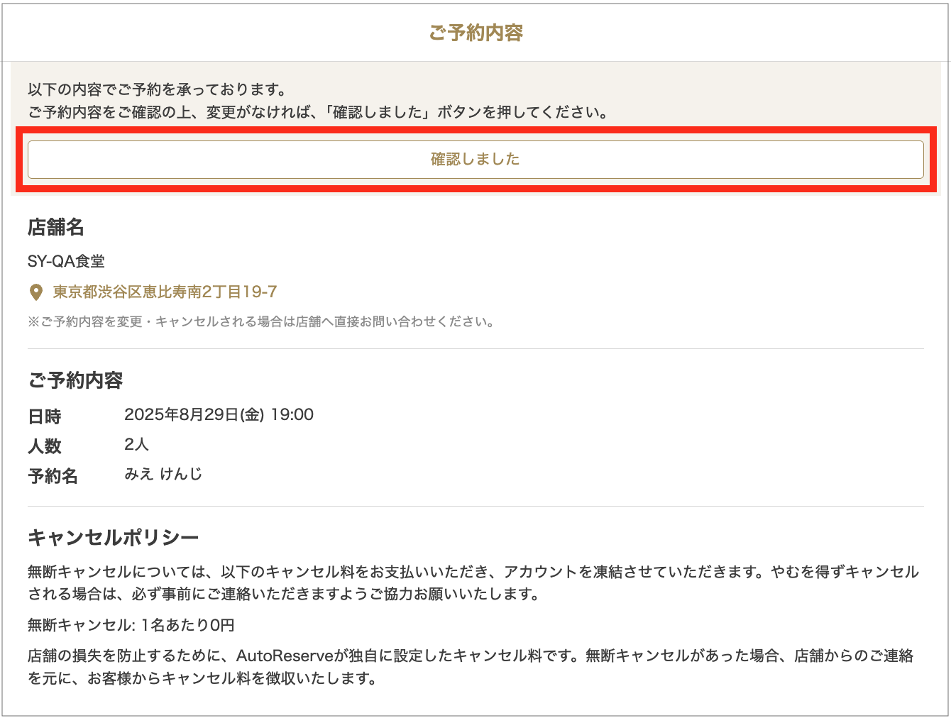 URLを開き「確認しました」ボタンを押すと、確認が完了し、予約ステータスが自動で「確認済み」に更新されます。