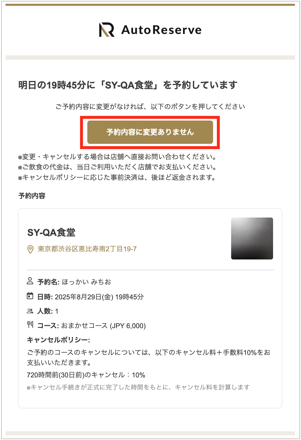 メール本文の「予約内容に変更ありません」ボタンを押すと、確認が完了し、予約ステータスが自動で「確認済み」に更新されます。