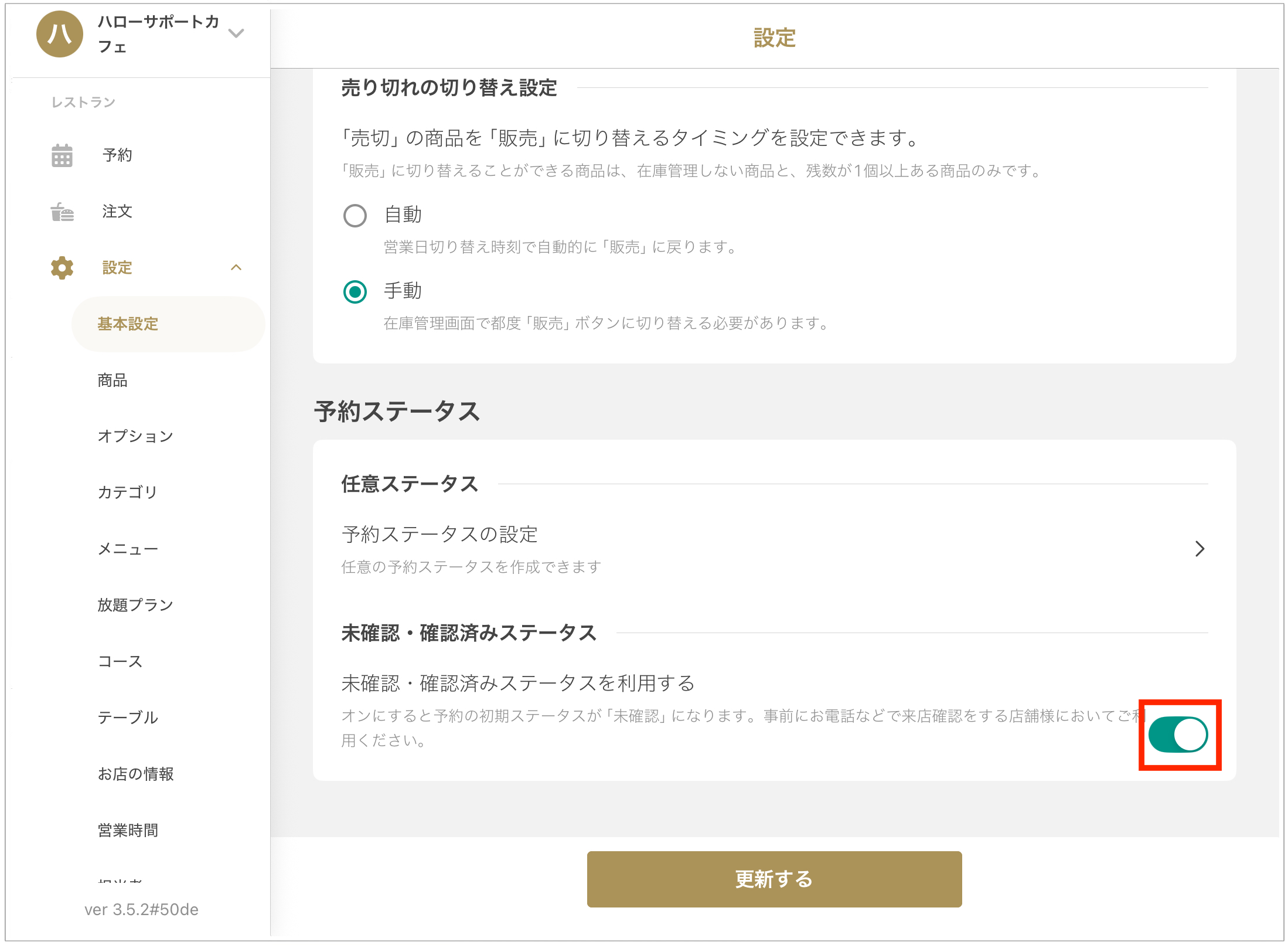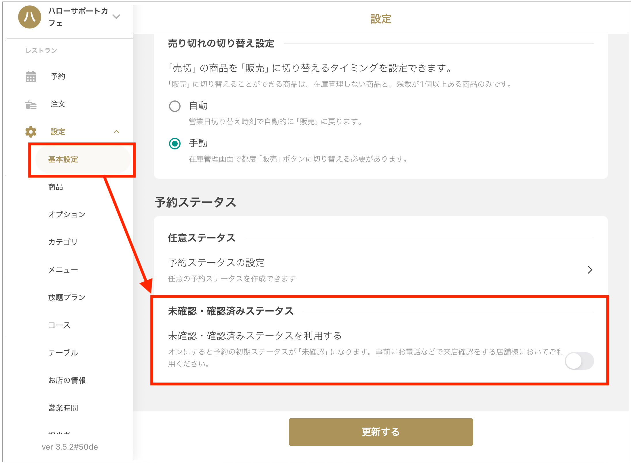 1. 「レストラン」>「設定」>「基本設定」を開き、画面の最下部までスクロールして「未確認・確認済みステータス」を確認します。