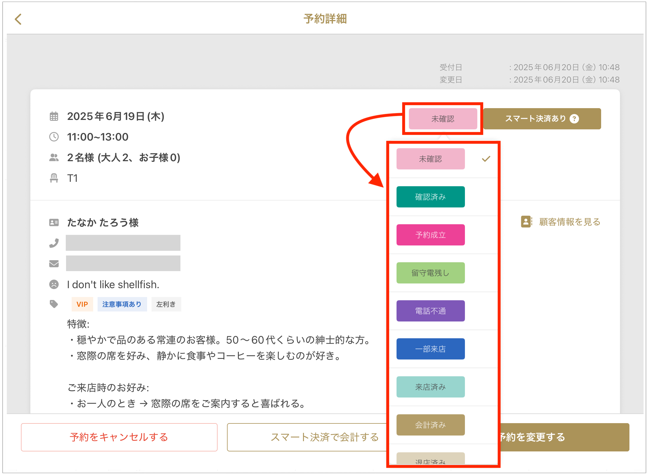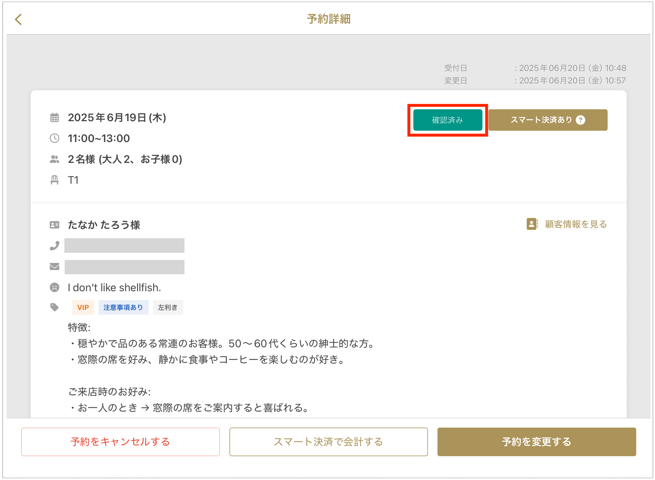2. 予約成立後、お客様へ事前連絡などを済ませたら、店舗の運用にあわせて、予約詳細画面からステータスを「確認済み(グリーン)」などに変更します。