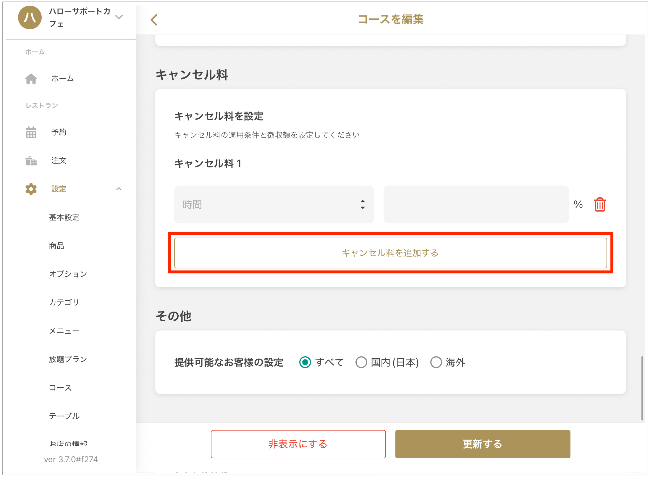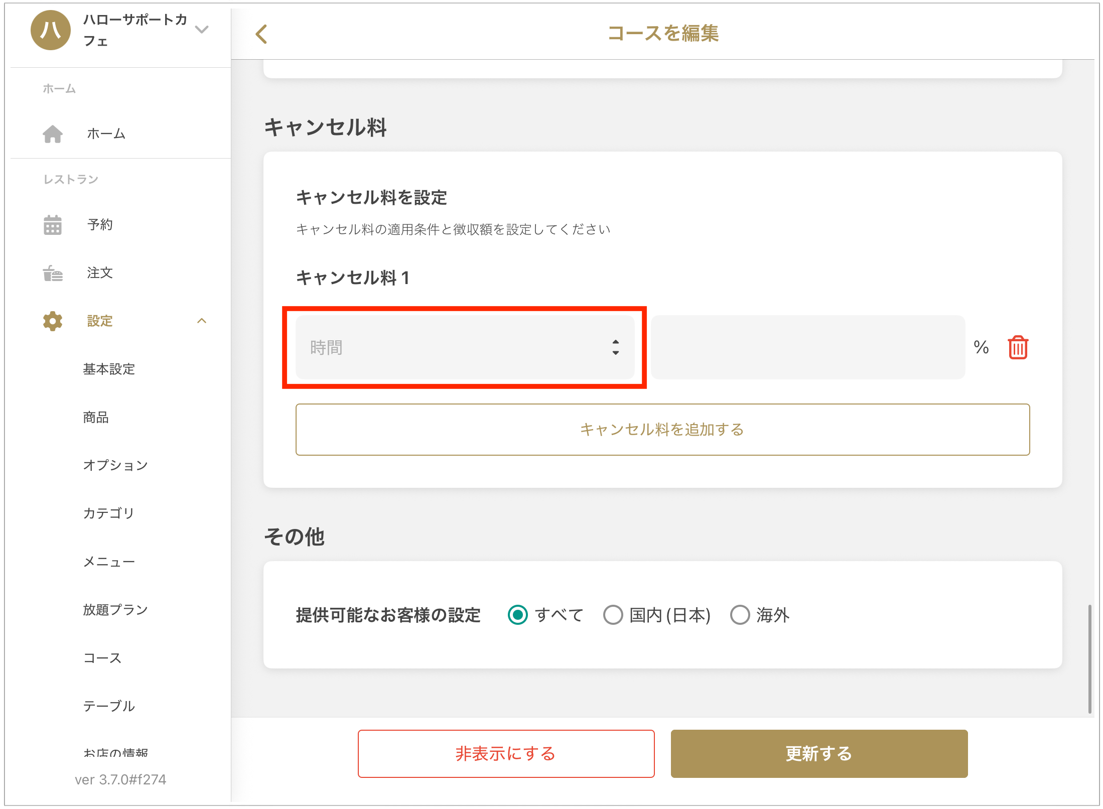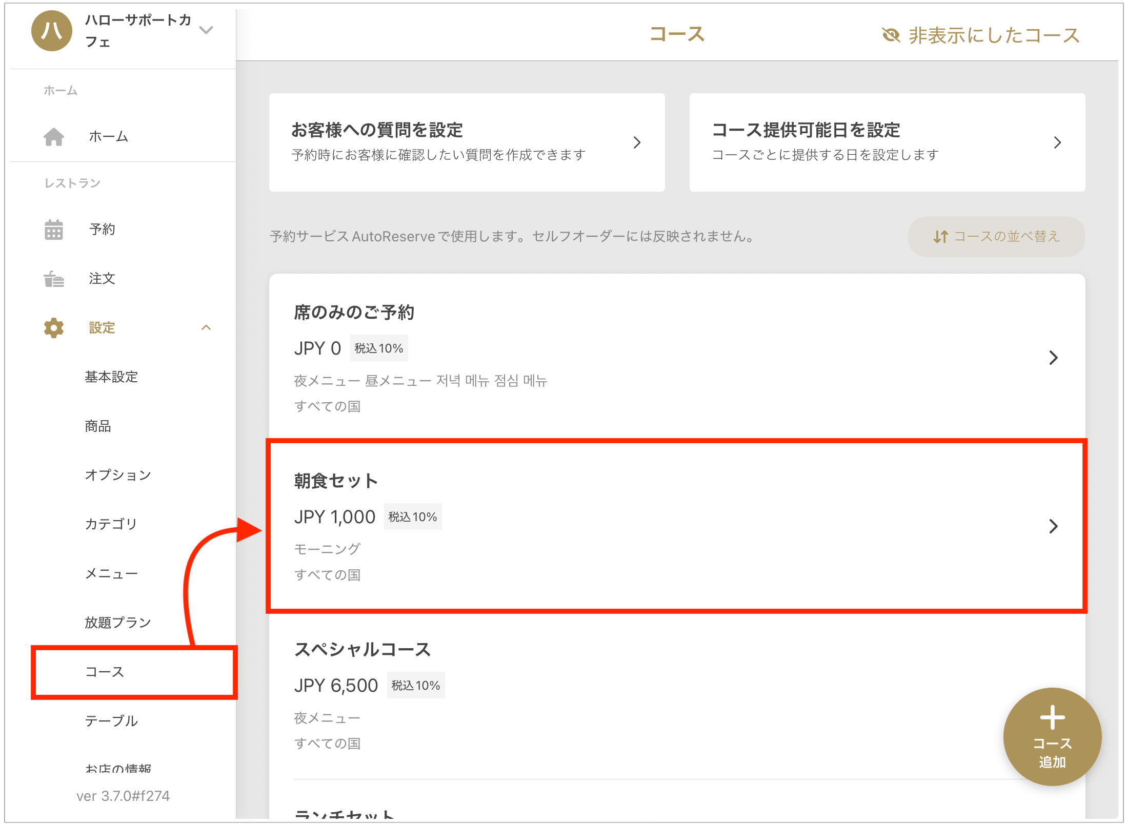 1. 「レストラン」>「設定」>「コース」を開き、キャンセル料の編集をしたいコースを選択します。
