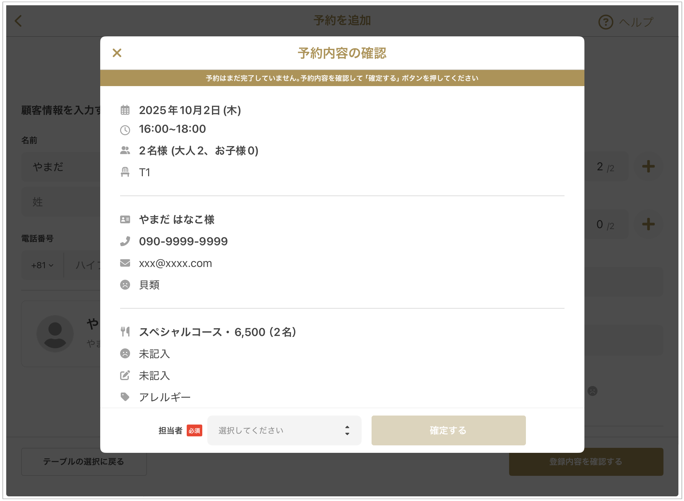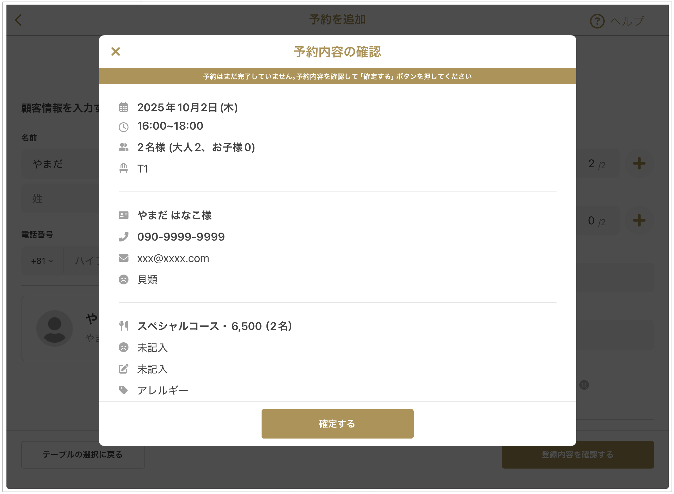 新規予約画面で顧客情報・コース・アレルギーなどを入力し、「登録内容を確認する」ボタンを押した後に表示される「予約内容の確認」画面が以下のとおり、ポップアップとして表示されるようになりました。