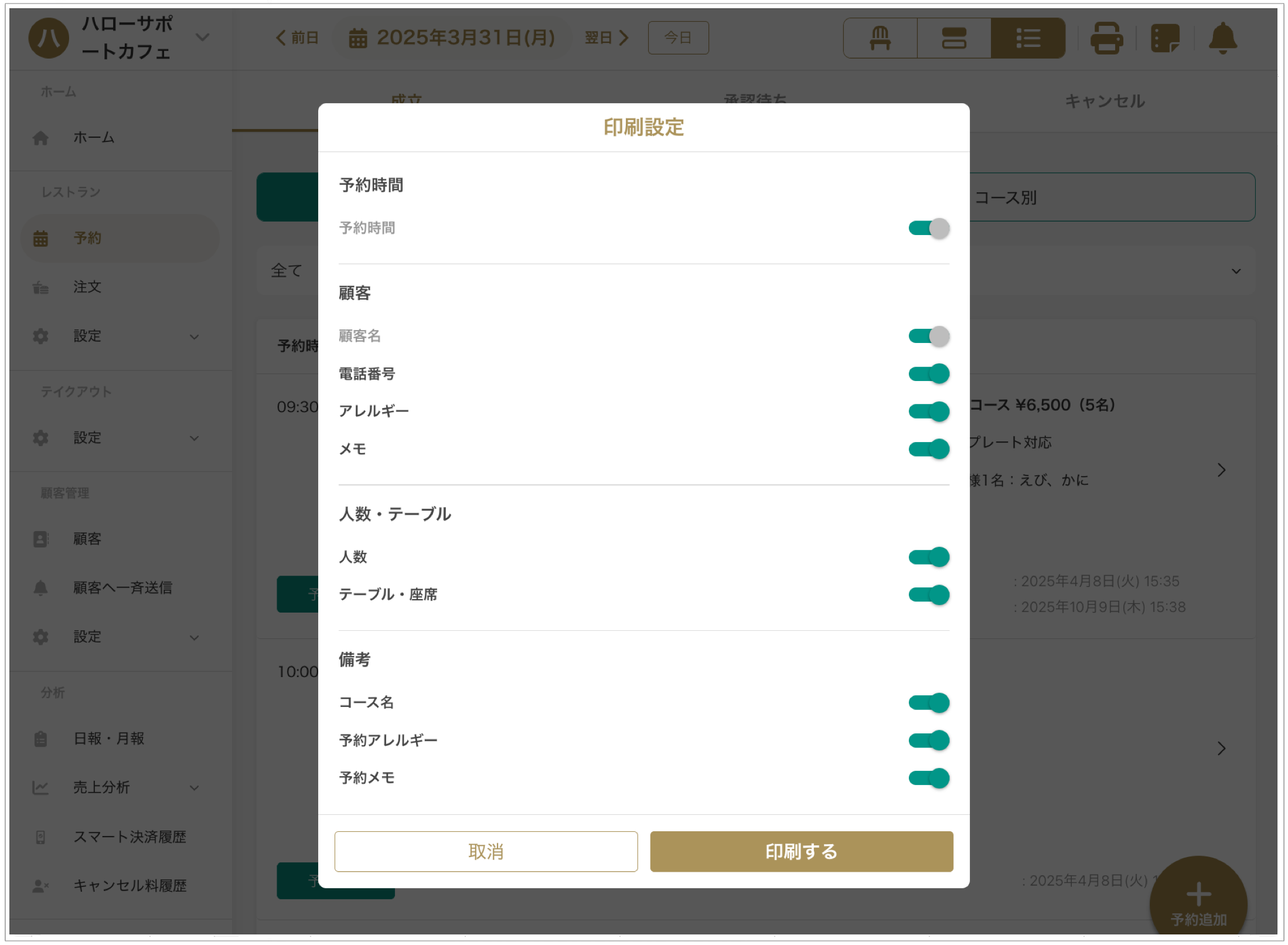 これにより、店舗のオペレーションにあわせて、必要な予約情報だけを印刷することができます。