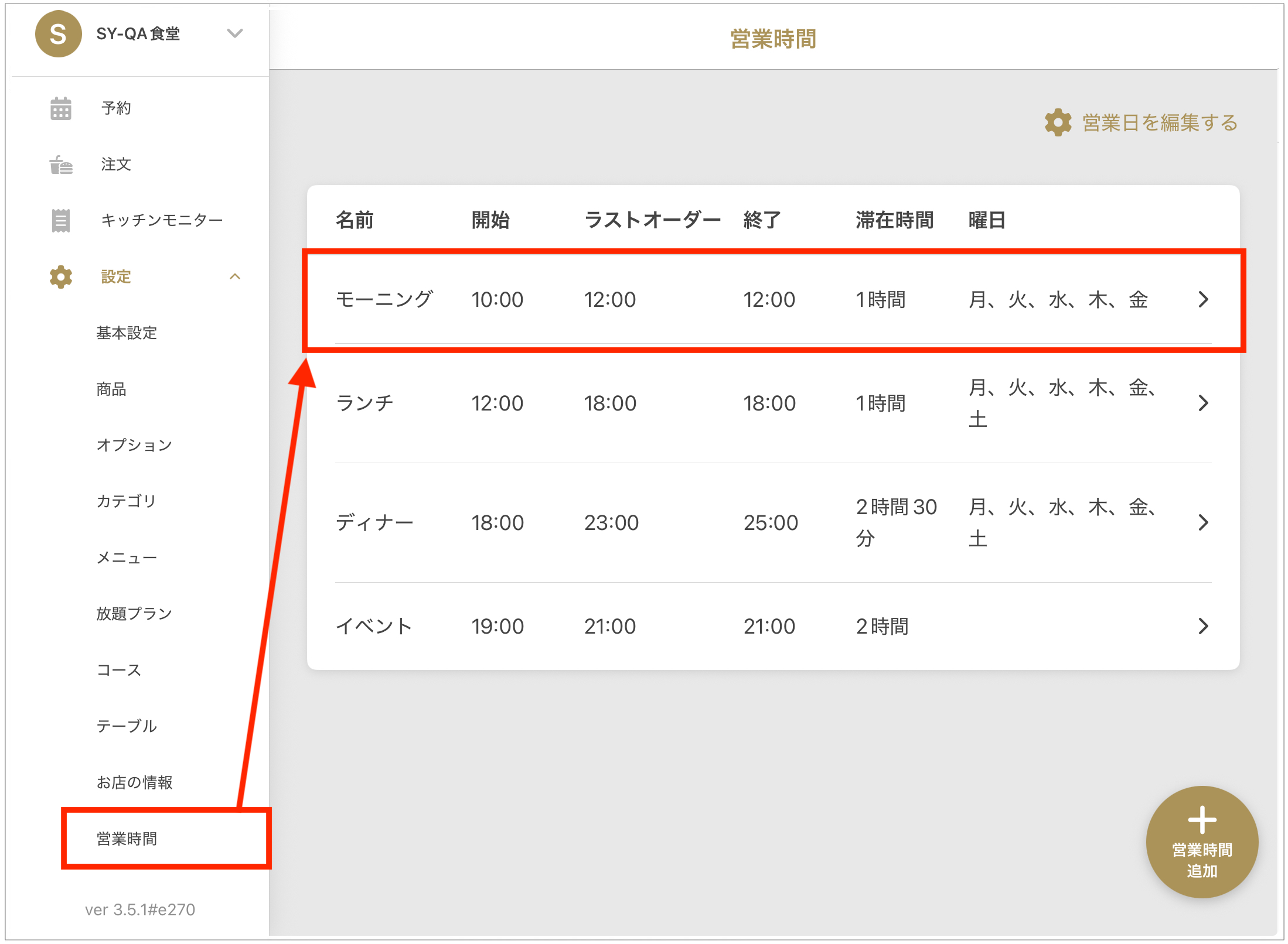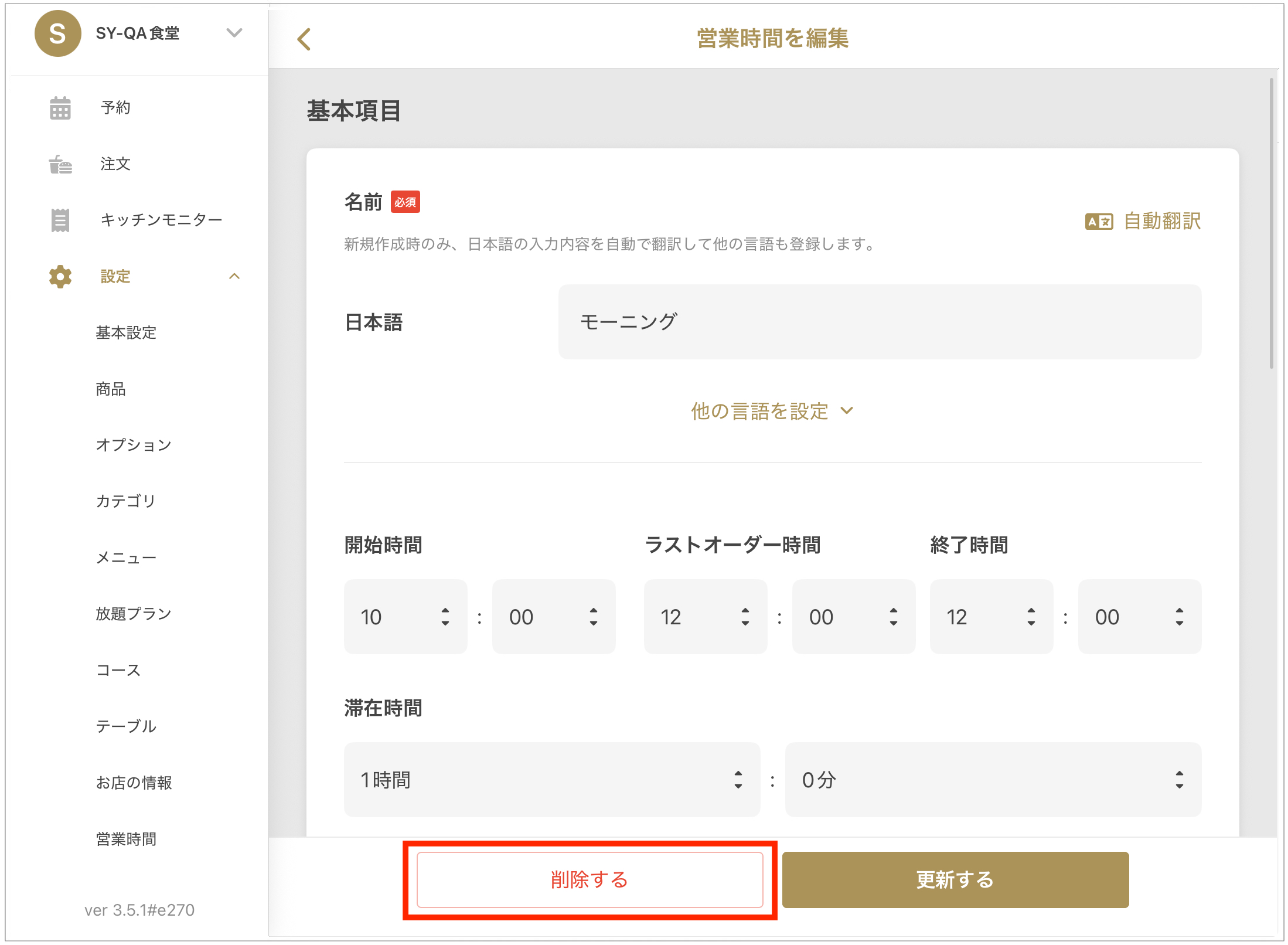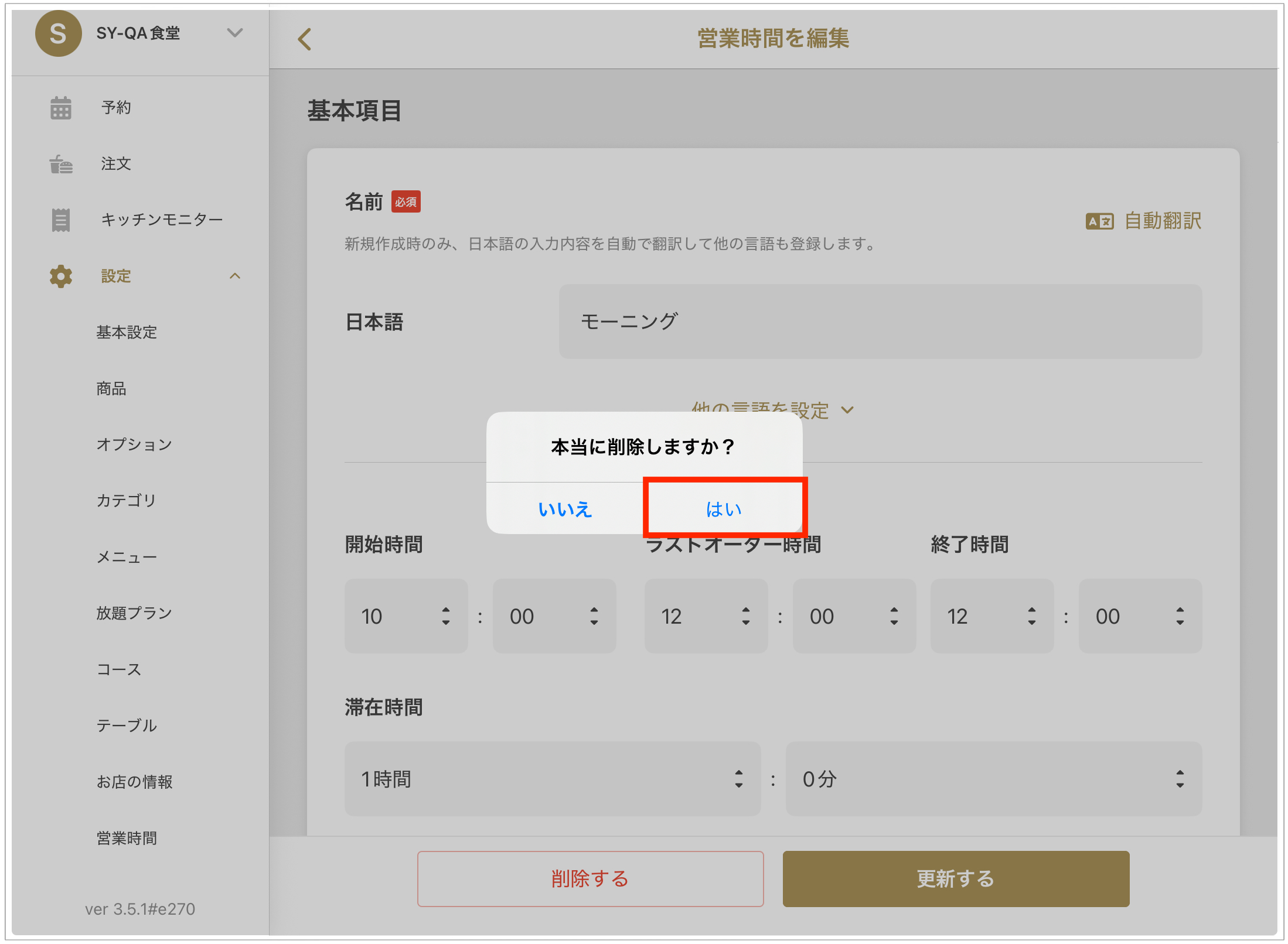 영업시간 삭제하기 (예약 대장) 2025년 09월 12일 07:21 업데이트 시간 더 이상 필요하지 않은 영업시간을 삭제하는 방법을 안내드립니다.1. **「레스토랑」>「설정」>「영업시간」**을 엽니다.2. 삭제하려는 영업시간을 선택합니다.3. 화면 하단의 「삭제하기」 버튼을 선택합니다.**「정말로 삭제하시겠습니까?」**라는 메시지가 표시되면, **「예」**를 선택하여 삭제를 완료합니다.※주의※한 번 삭제한 영업시간은 되돌릴 수 없습니다. 신중히 진행해 주세요. 관련 문서 영업시간 설정의 기본항목 좌석만 예약할 경우의 코스작성