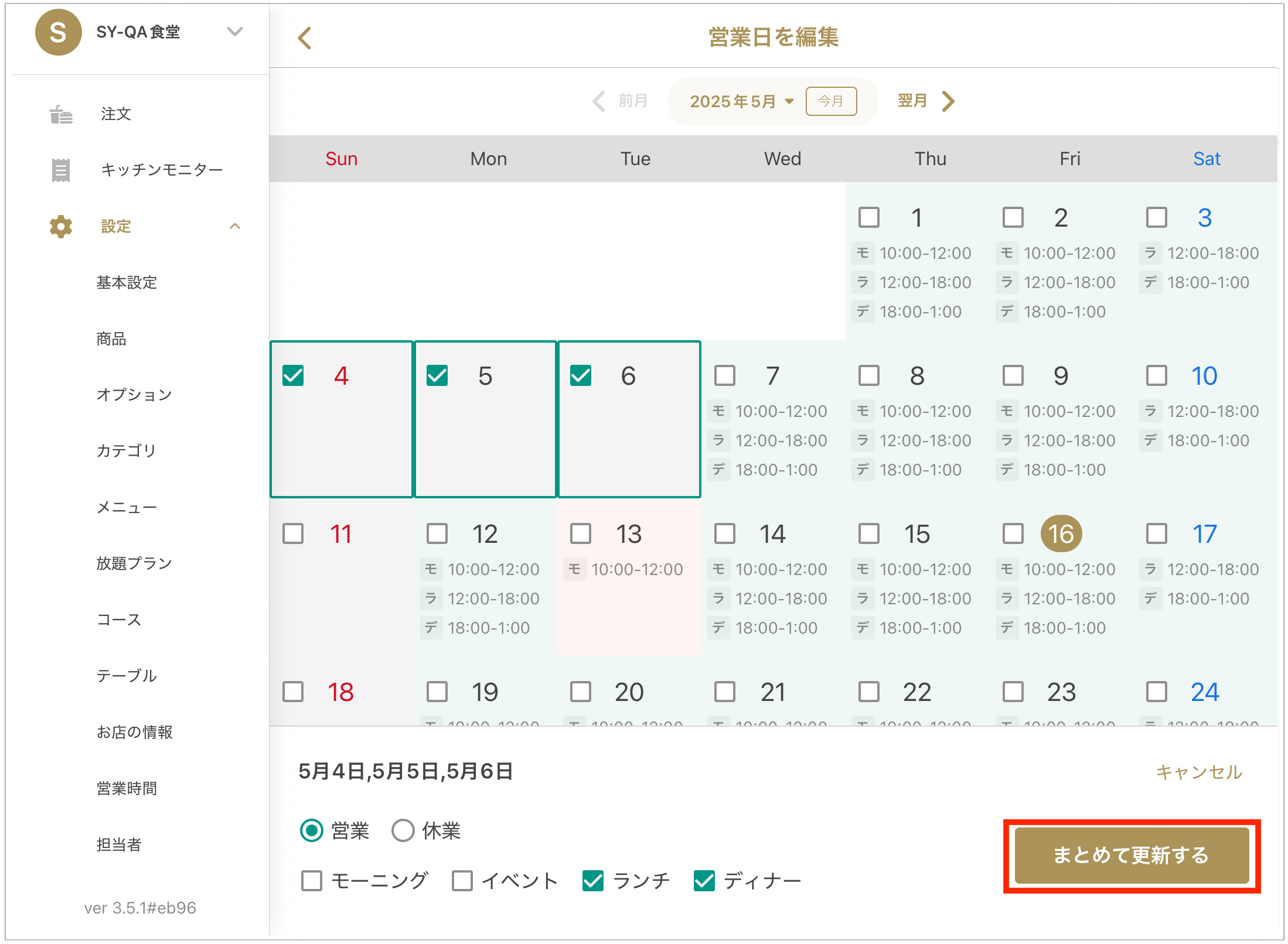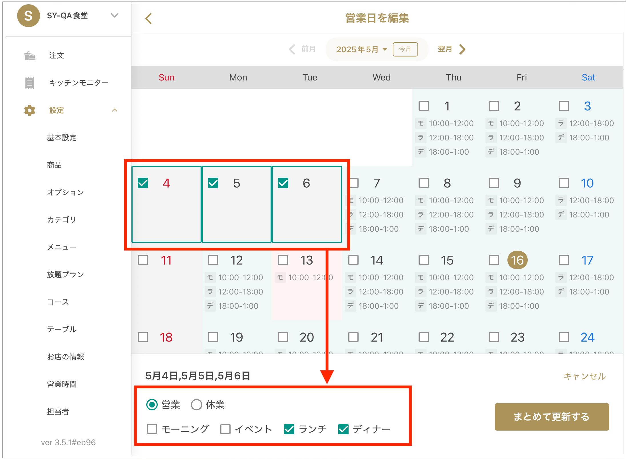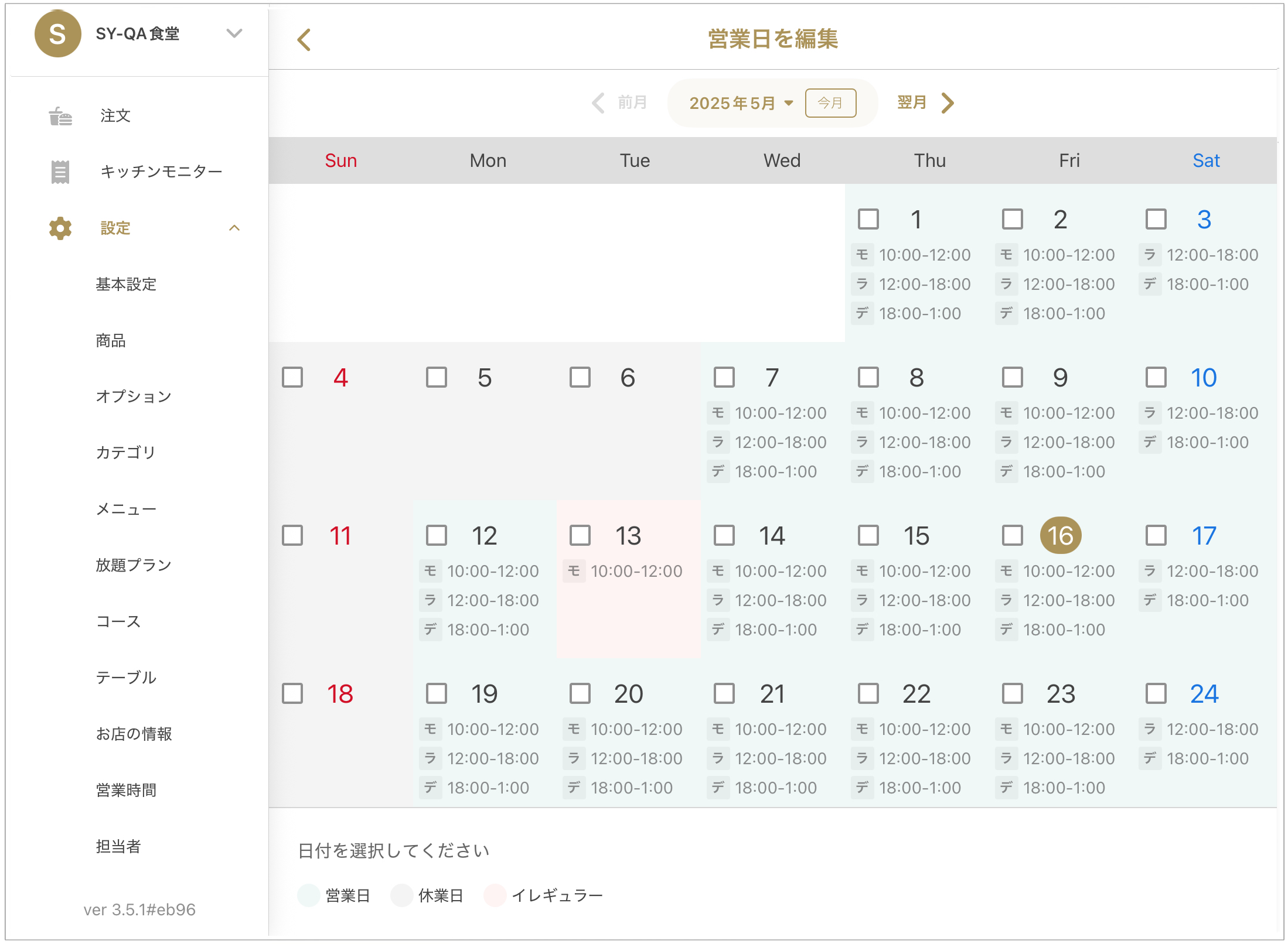 ※정기 영업 설정과 다르게 수정된 날짜는 「비정기 설정 」 색상 (빨간색)으로 표시됩니다.