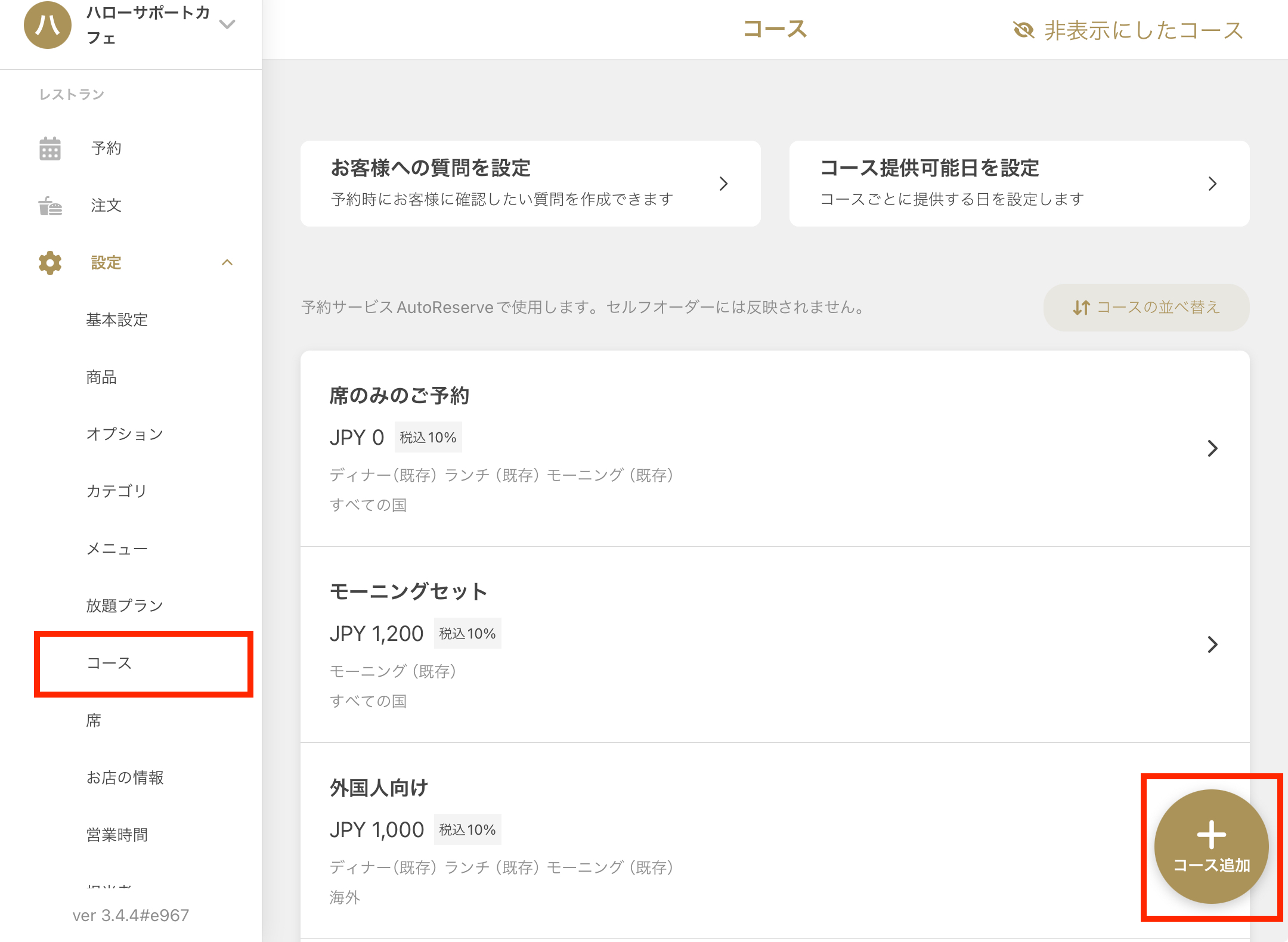 - 메뉴바에서**「레스토랑 > 설정 > 코스**를 선택합니다.