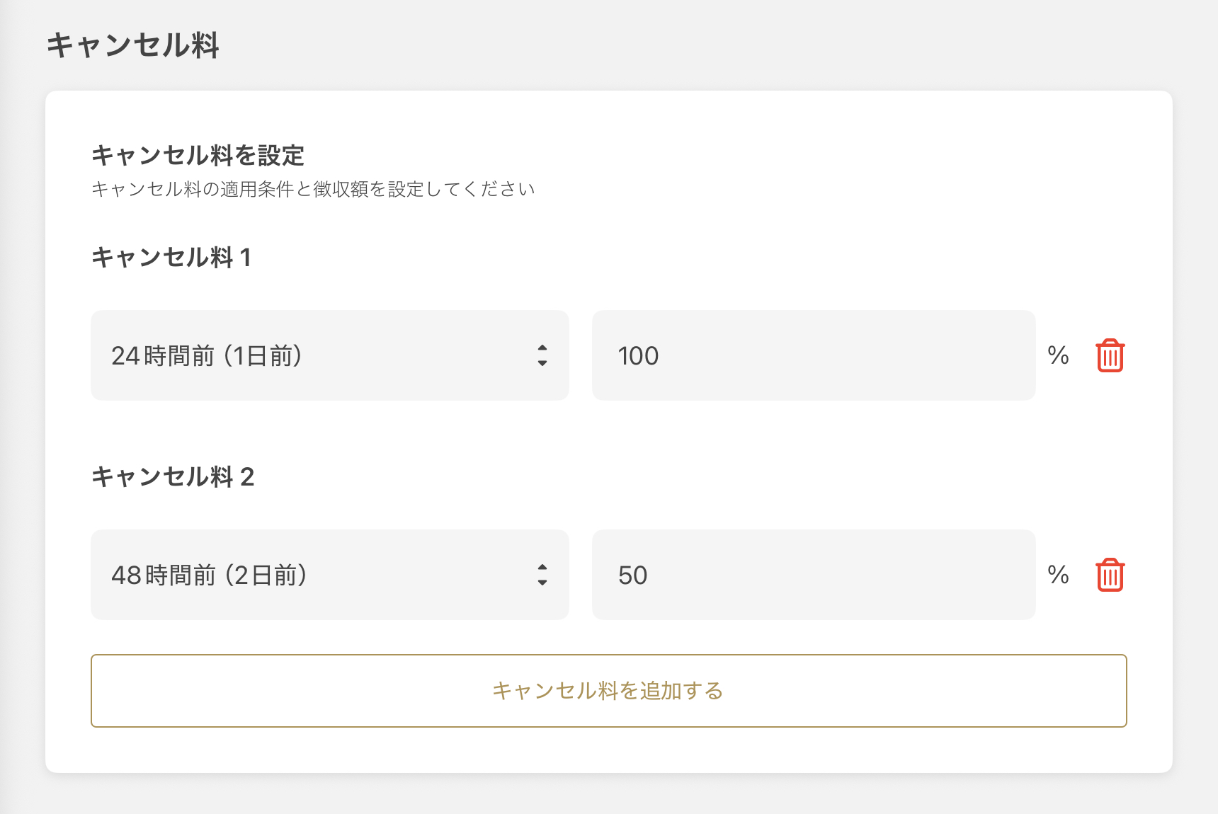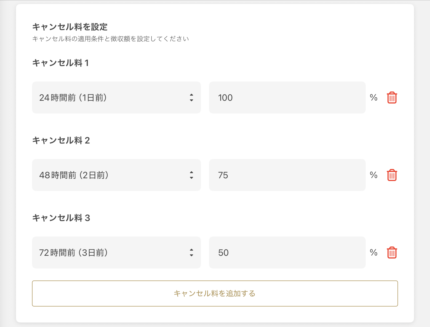 ※취소 수수료는 한가지 코스안에서 복수설정이 가능합니다.