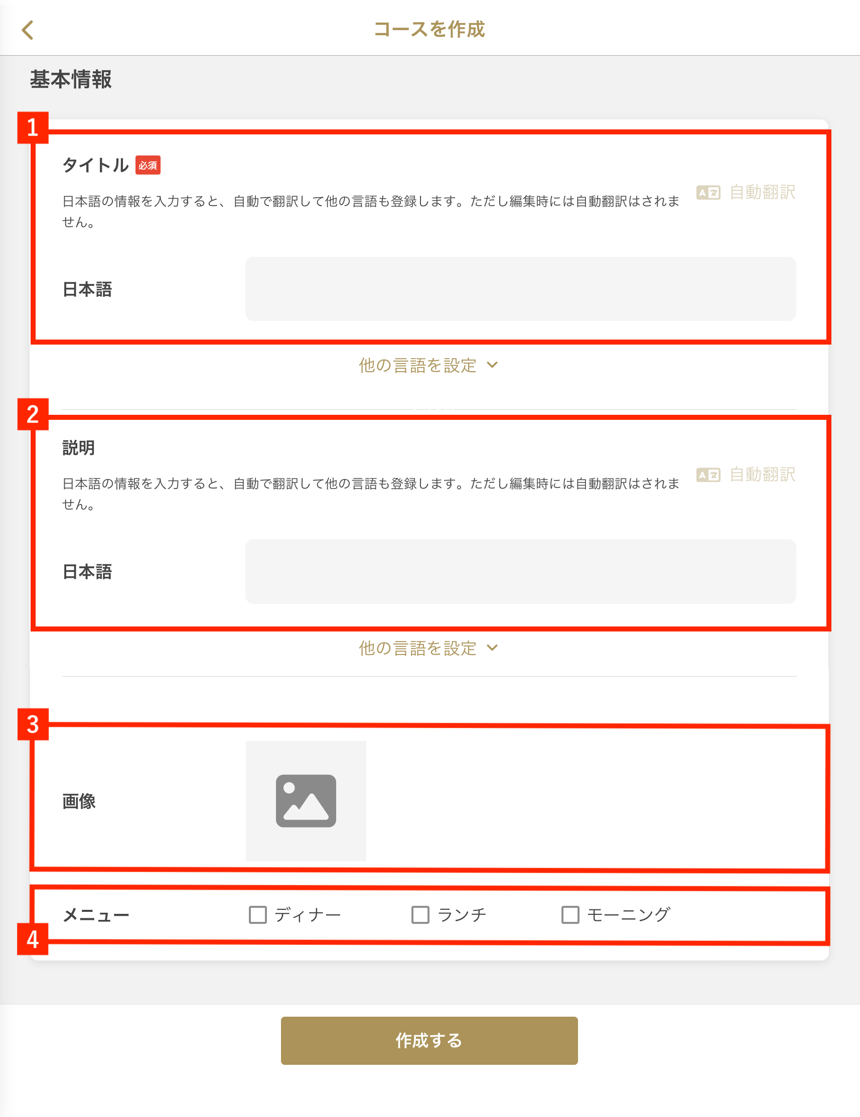 〜MEMO〜 (예) ・디너 시간대에 제공하는 코스는 「디너」메뉴에 체크 ・런치와디너 양쪽의 시간대에 제공하는 코스는 「런치」「디너」메뉴에 체크