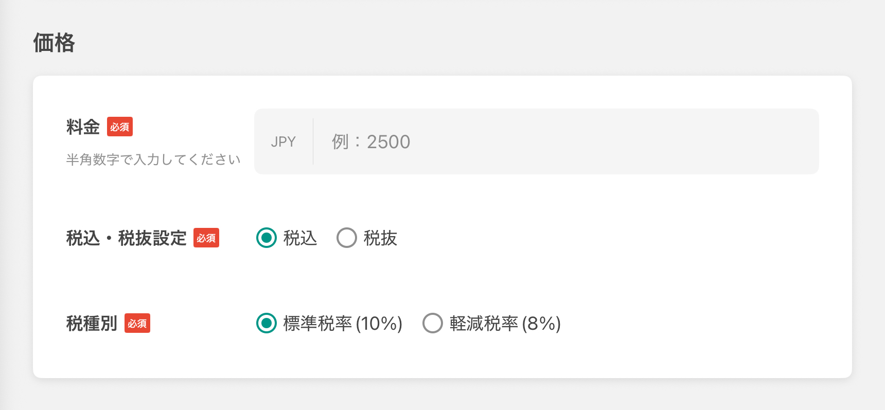 - 세금포함・세금별도설정 후 설정한 요금을「세금포함」또는「세금별도」중에 선택합니다.