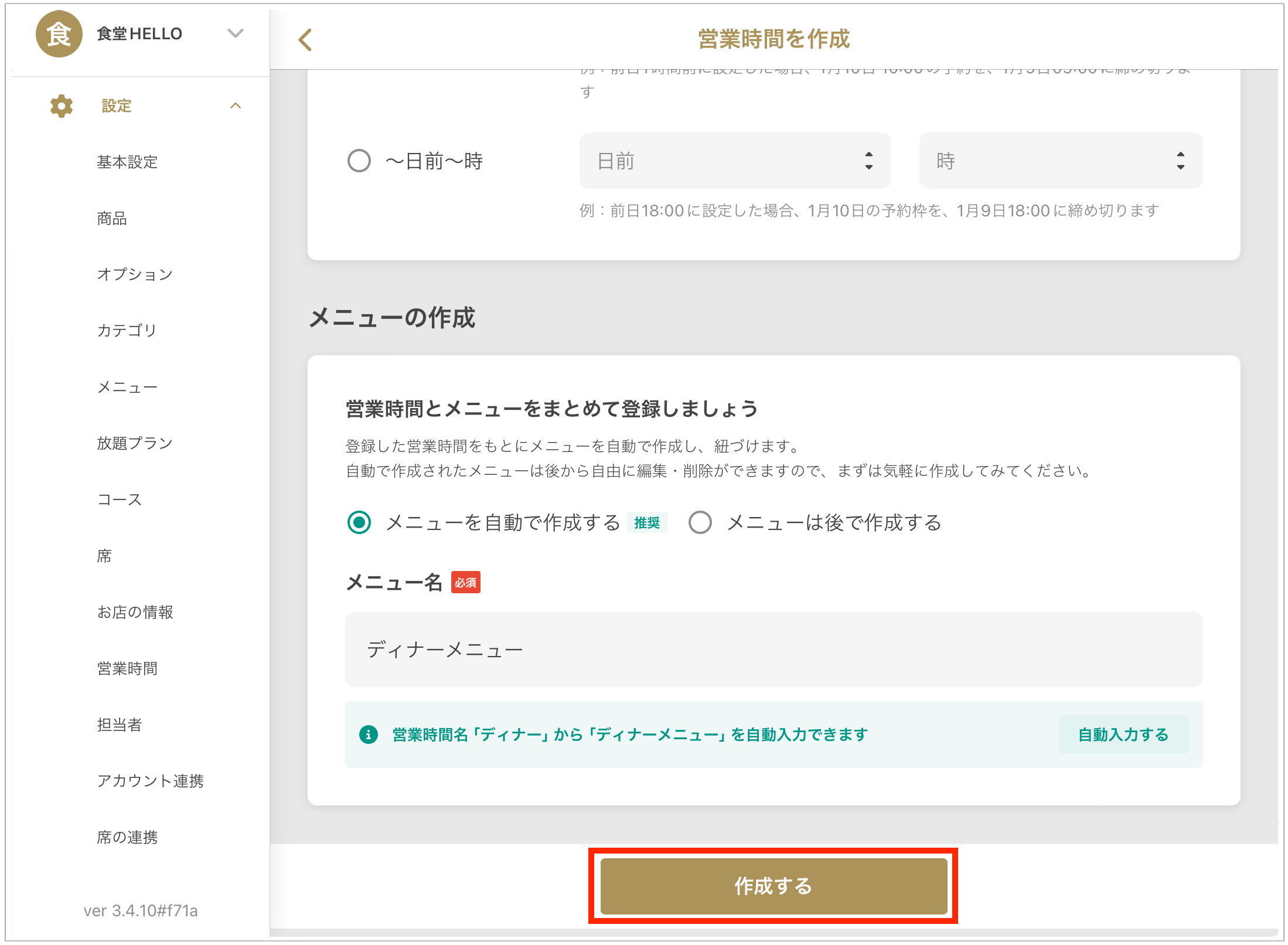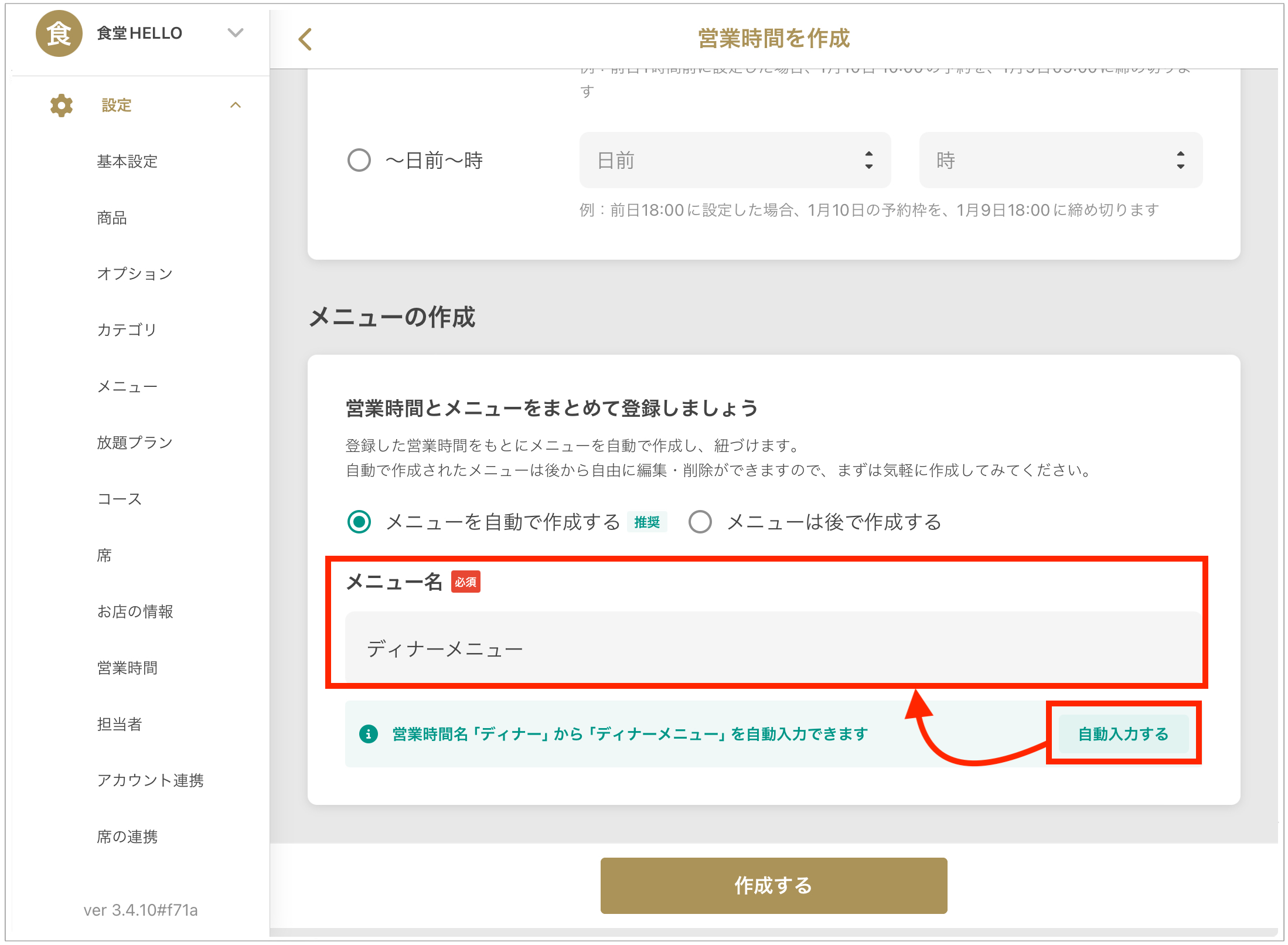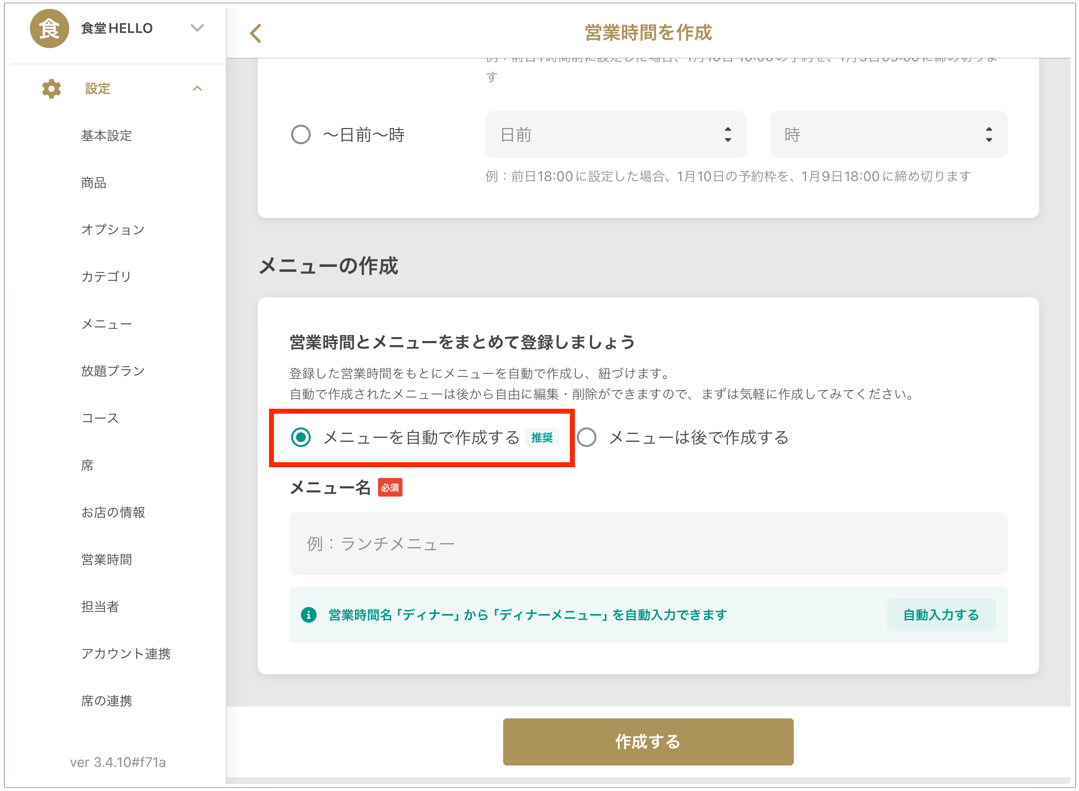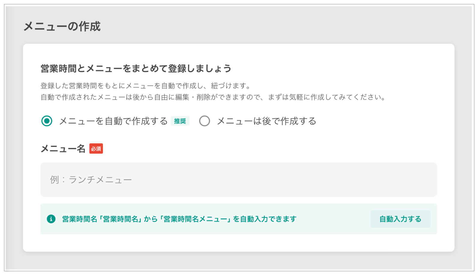 - 기본 항목 입력 후, 「메뉴를 자동으로 작성」을 선택합니다.