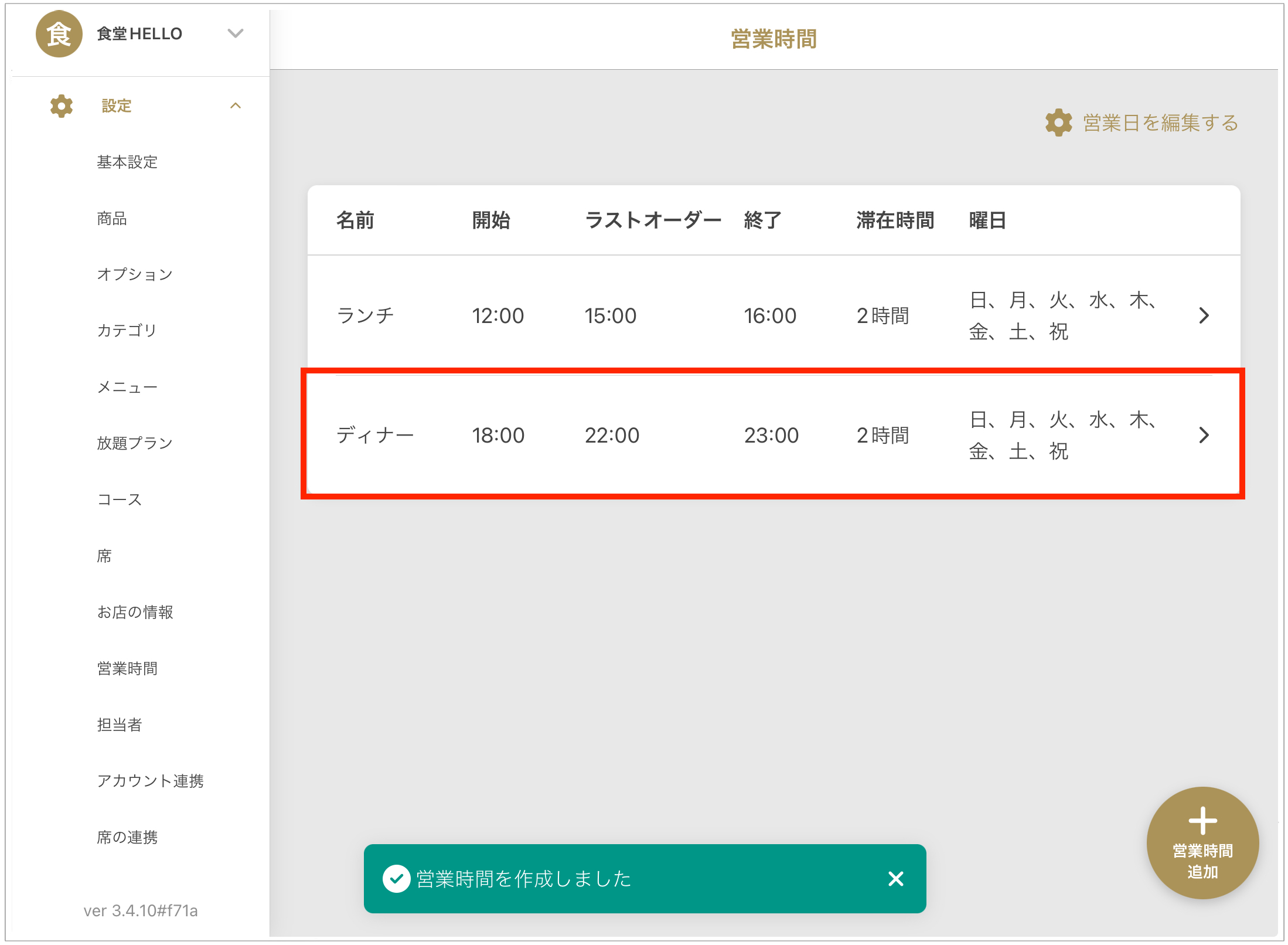 「설정」>「영업시간」>「영업시간 추가」を選択します。