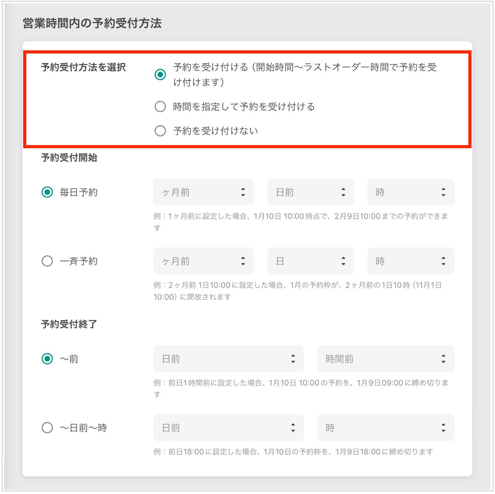 자세한 설명은【영업시간 설정의 예약 접수 방식】을 참고해 주세요.