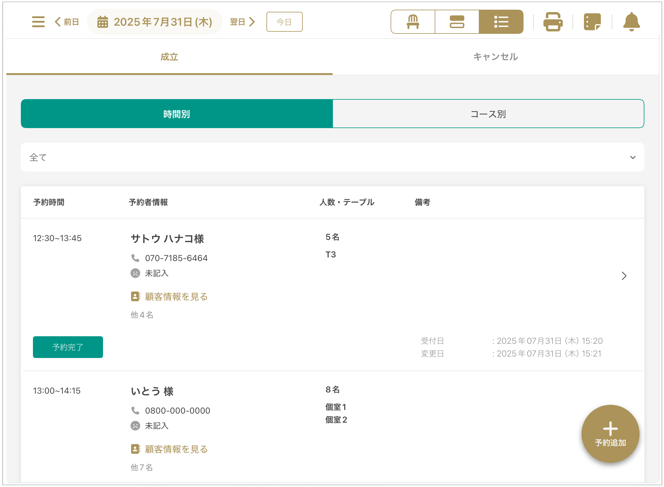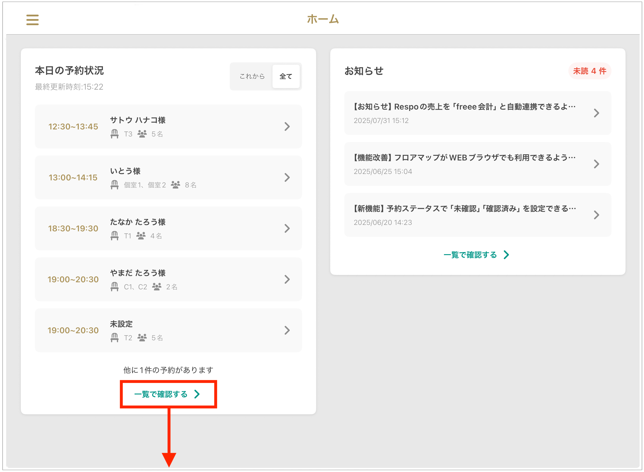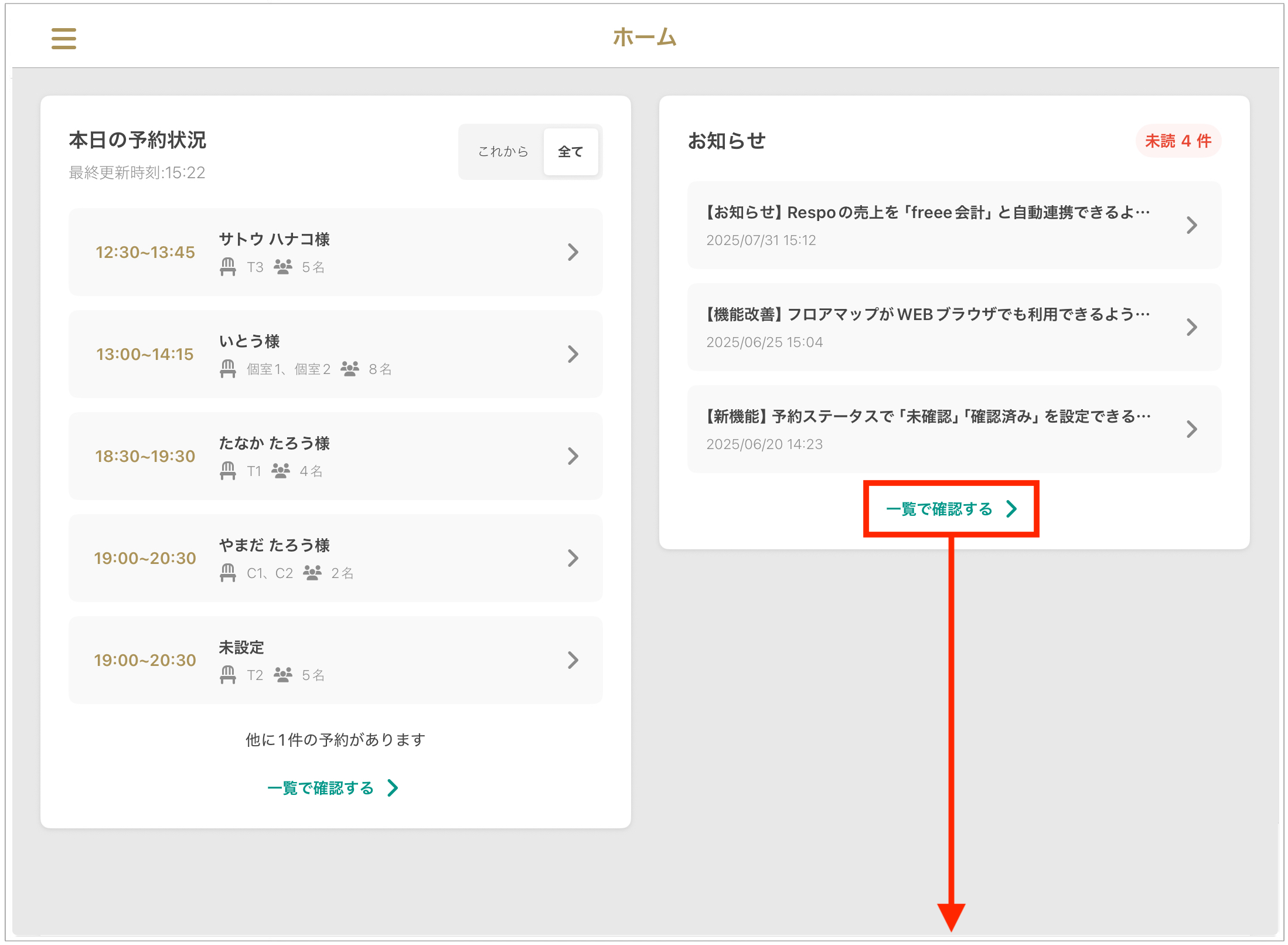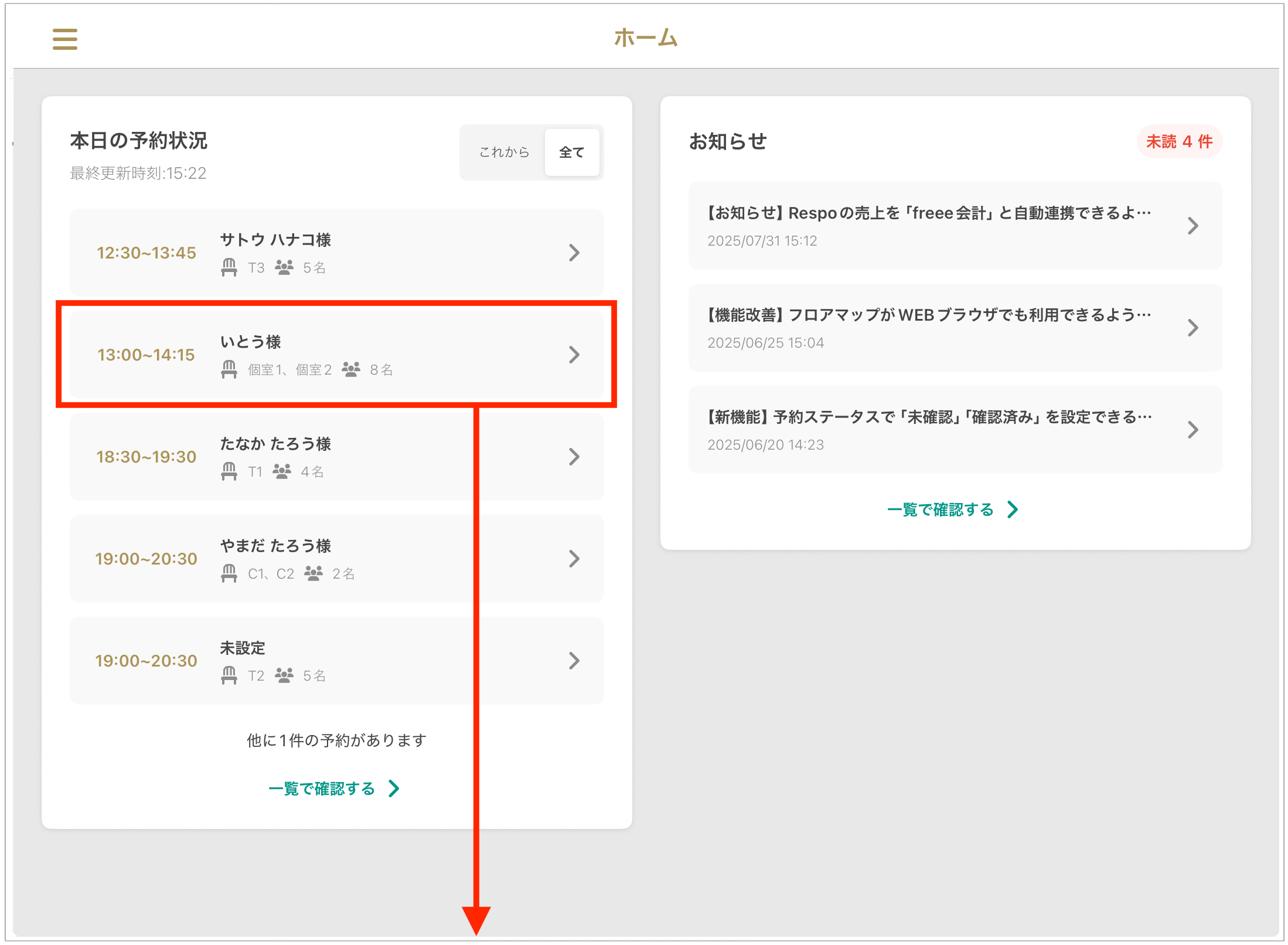 3. **「목록에서 확인하기」**를 누르면 당일 전체 예약을 확인할 수 있는 페이지로 이동합니다.