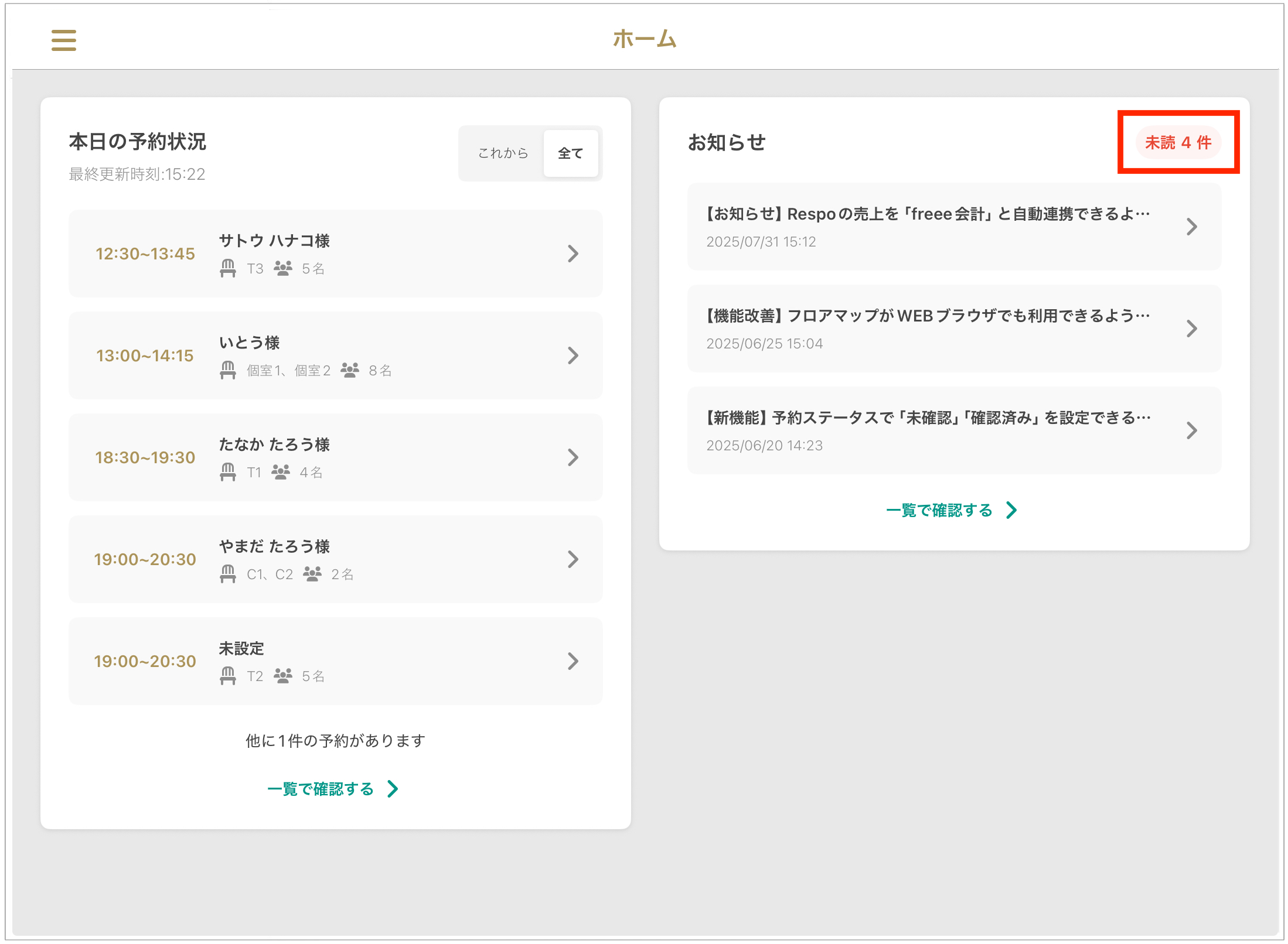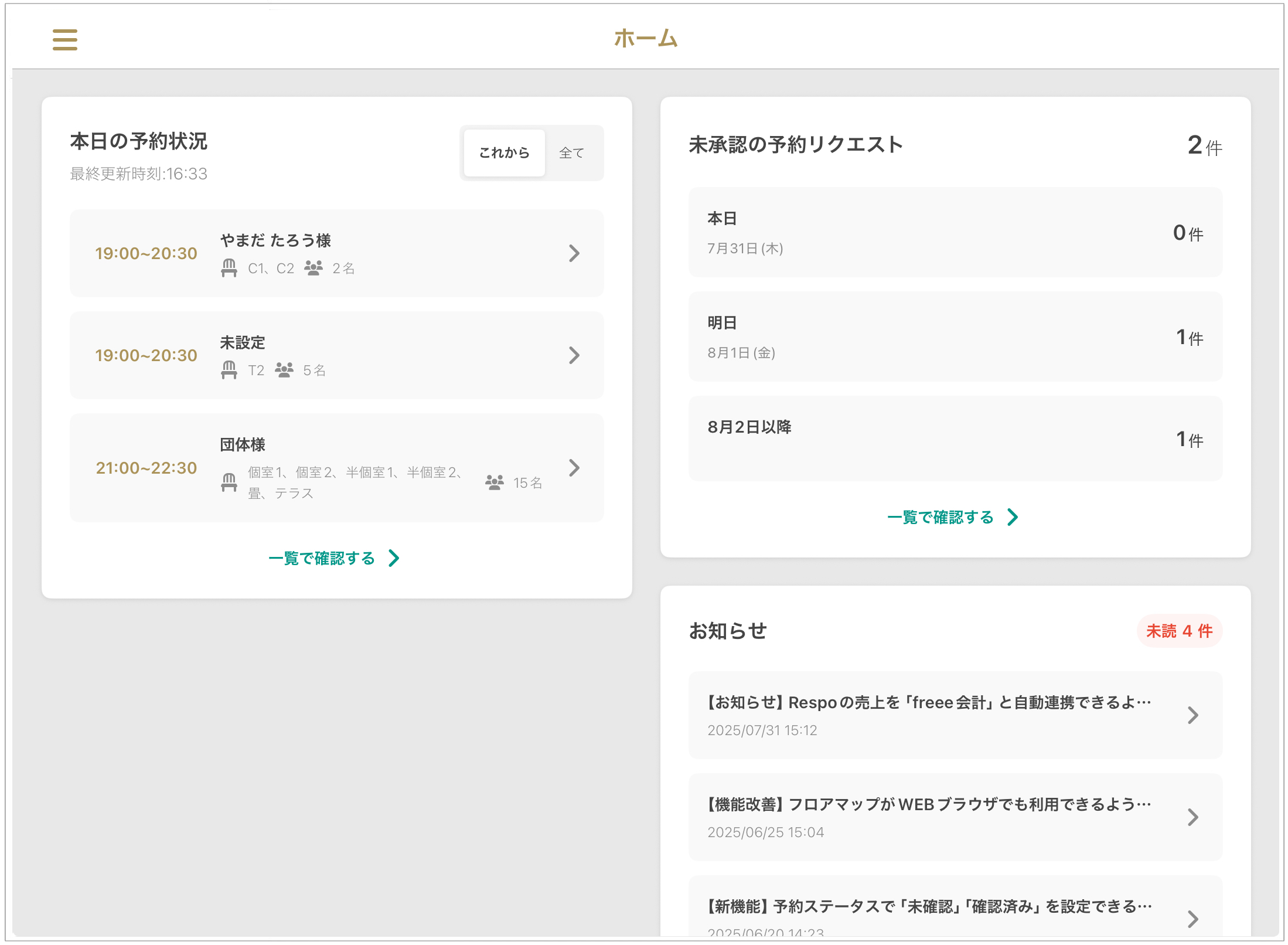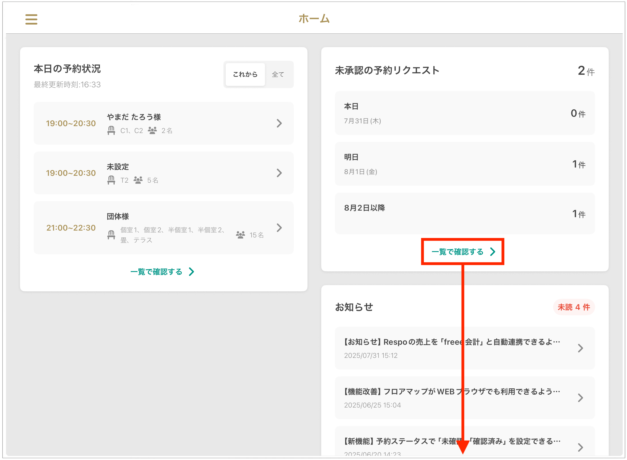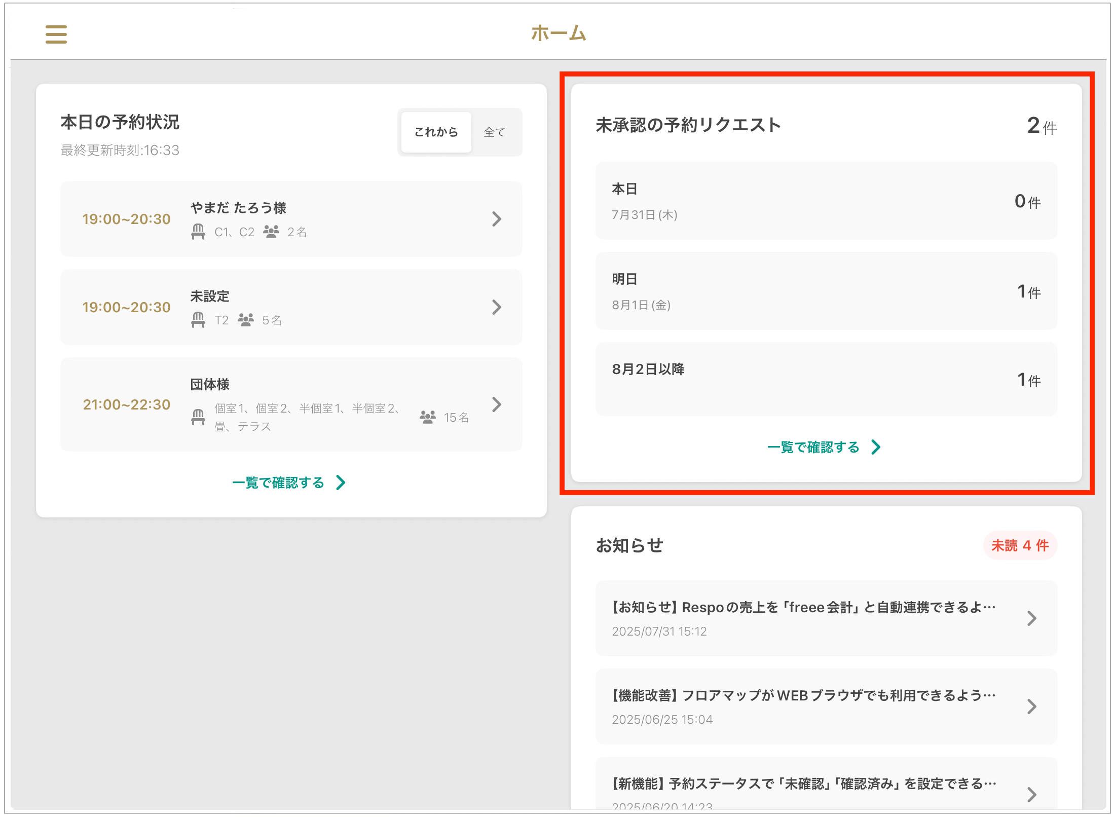 홈 화면은 당일 예약 상황, 공지 사항, 승인되지 않은 예약 요청(※대상 매장에 한함) 등을 한눈에 파악할 수 있는 유용한 대시보드입니다.