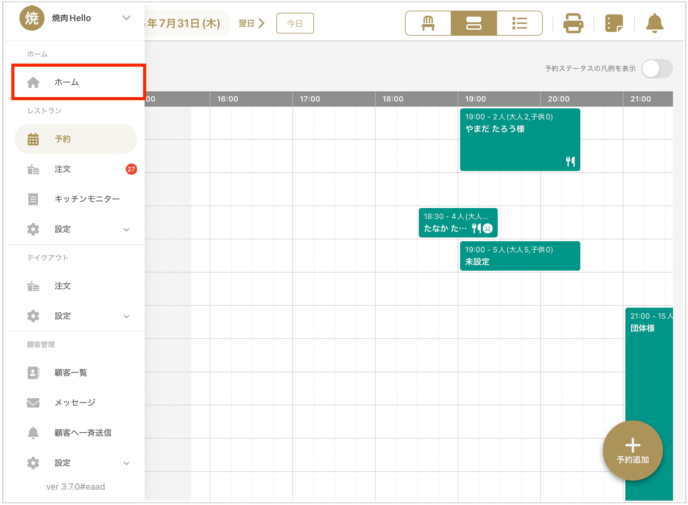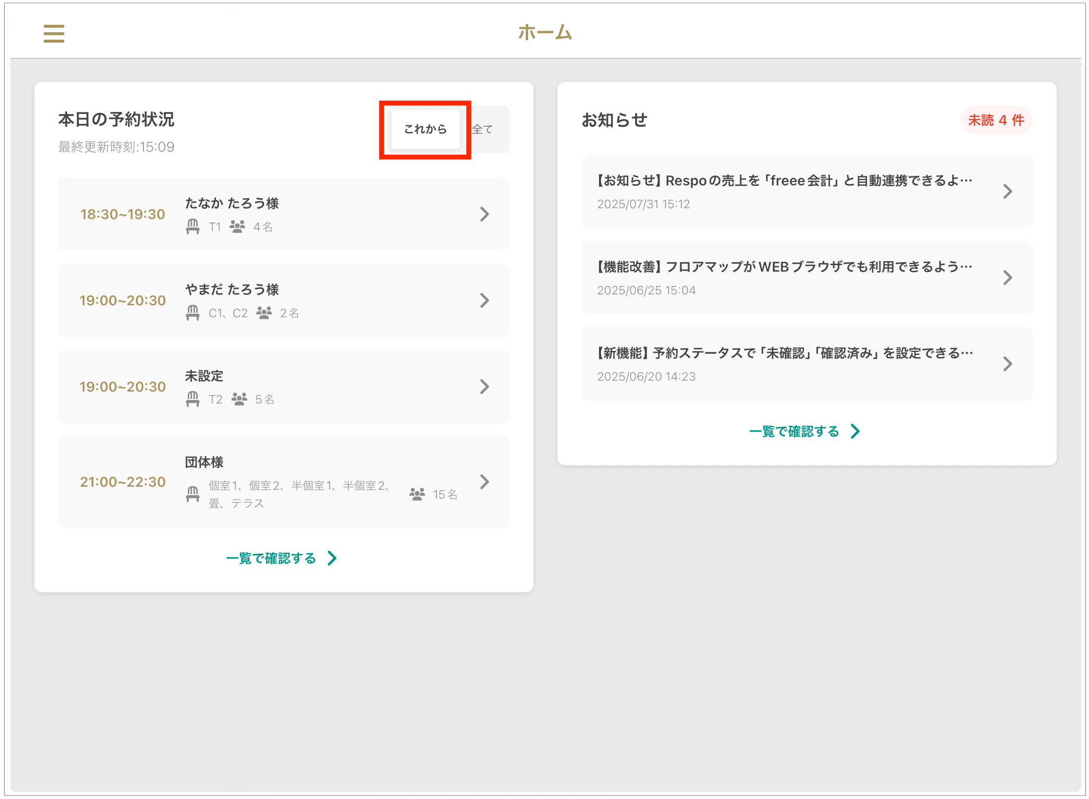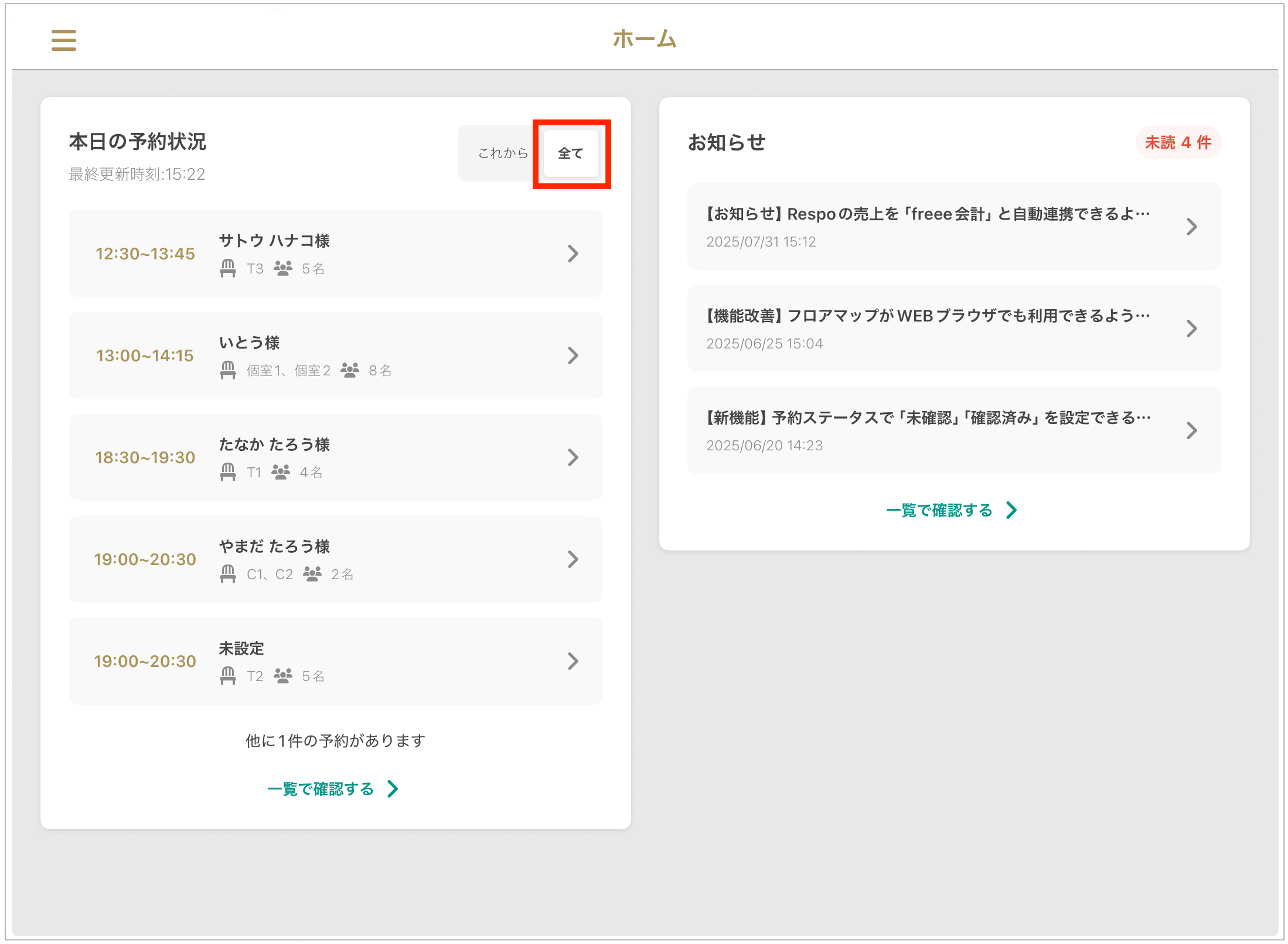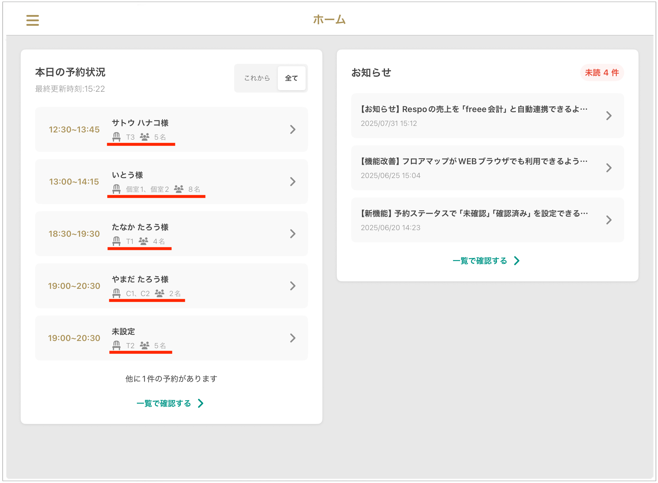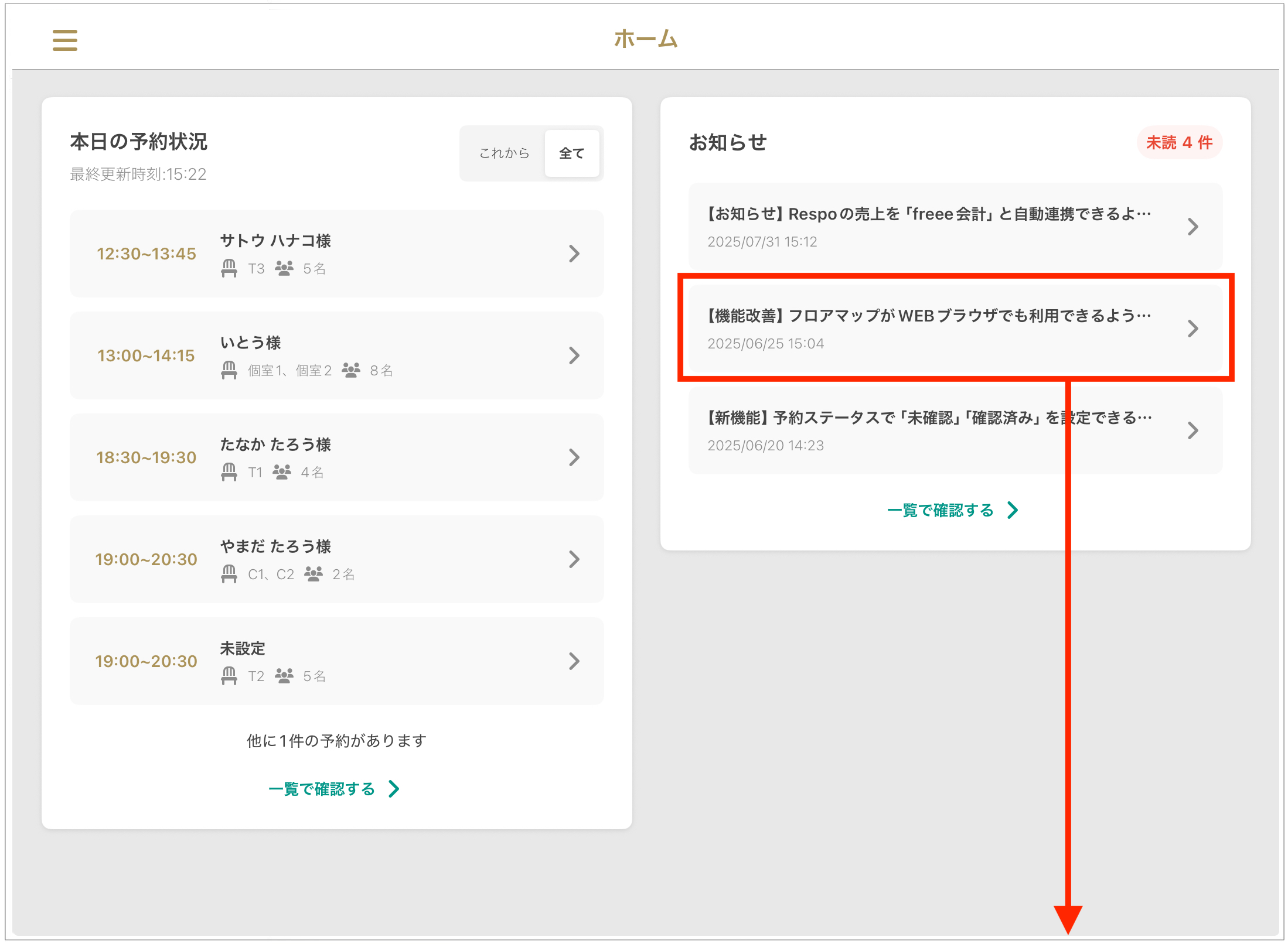 홈 화면은 당일 예약 상황, 공지 사항, 승인되지 않은 예약 요청(※대상 매장에 한함) 등을 한눈에 파악할 수 있는 유용한 대시보드입니다.